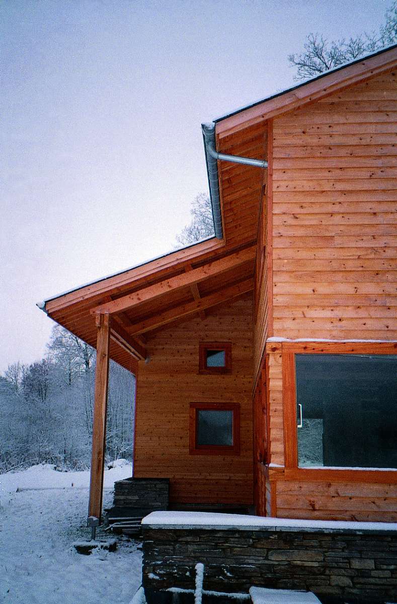 La volumétrie est inspirée de la typologie des fermes à auvents de la Vallée de la Lienne; le bardage en clins de thuya local et les cadres des baies en mélèze s’apparentent à l’architecture d’essentage de l’Ardenne Herbagère. L’implantation tire parti de la beauté du lieu; la maison est ouverte sur le paysage au levant et au Sud. A l’Ouest, un jardin plus intime borde un étang existant. Les nombreuses ouvertures sont calibrées en fonction de l’ordonnance intérieure et des vues sur le paysage voulues par les occupants. La distribution interne concilie le confort intimiste et la vie à la campagne. Tous les bois mis en oeuvre sont locaux et fournis par le maître d’ouvrage ; les différentes essences ont été réparties et assorties par pièces, leur conférant à chacune une ambiance particulière. La priorité a été donnée à la qualité d’exécution.