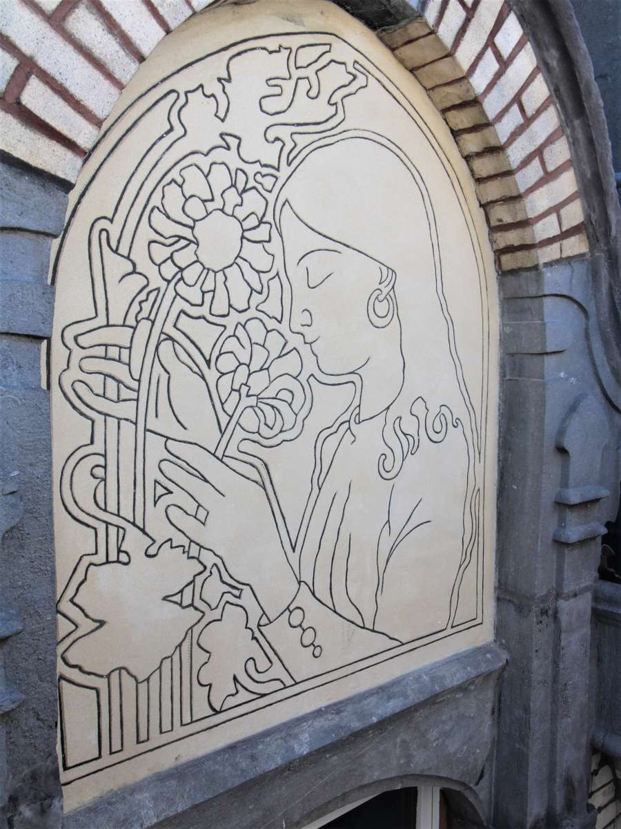 Maison de commerce et d’habitation de style Art Nouveau réalisée par l’architecte Ernest Blérot (1870-1957) dans le quartier Saint-Boniface à Ixelles. Destinée à l’origine à une fonction de cabaret au rez-de-chaussée, dont les employés logeaient aux étages, la maison a conservé son affectation commerciale, et comprend trois appartements distincts aux étages. Elle s’inscrit dans l’ensemble Art Nouveau du Quartier St Boniface, dans lequel Ernest Blérot réalise 10 maisons du même style. La façade principale a fait l’objet de plusieurs campagnes de restauration (1980 -1990) approchant plus ou moins l’état d’origine et plus récemment, de transformations malheureuses (remplacement du châssis du pignon chantourné, réfections de joints des maçonneries, vitrine du rez-de-chaussée, etc.). Le projet vise a permis la restauration des menuiseries extérieures (porte d’entrée, cartouche de l’enseigne commerciale et châssis en chêne vernis) et des maçonneries endommagées, ainsi que la restitution d’éléments tels que les teintes d’origine des sgraffites, restaurés par Marie-Hélène Ghisdal, ou le décrottoir perdu. Les maisons-sœurs dessinées par Ernest Blérot dans les années 1900, entre autres à Saint Gilles, ont permis de restituer les éléments disparus sur une base documentée.