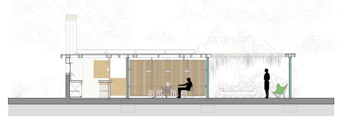 Sur le site d’un moulin à eau du XVIIème siècle, profondément transformé dans les années 1930, ancien pool house et piscine datant des années 1970. Le projet comprend le maintien de la piscine de forme organique existante et de la terrasse en opus incertum, et la rénovation du pool-house. Les maçonneries existantes ont été retravaillées et chaulées, avec l’adjonction d’une cheminée pour un foyer extérieur ; les nouvelles superstructures ont été réalisées en mélèze, tout comme le gîtage de couverture et son voligeage, repris par une ossature métallique. Les formes et les matériaux retenus dialoguent avec la piscine existante et le moulin à eau implanté à proximité.