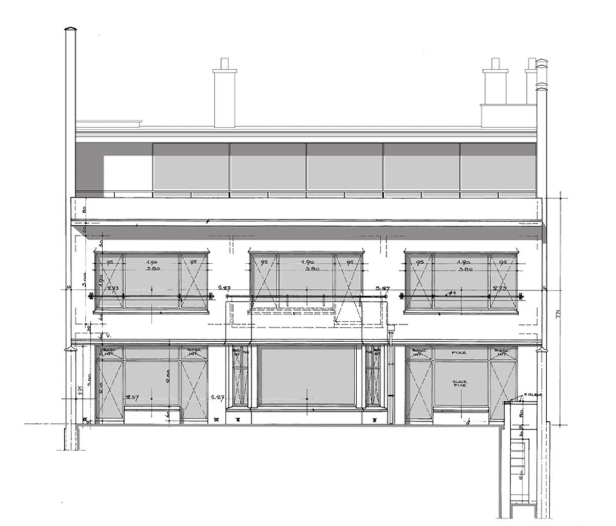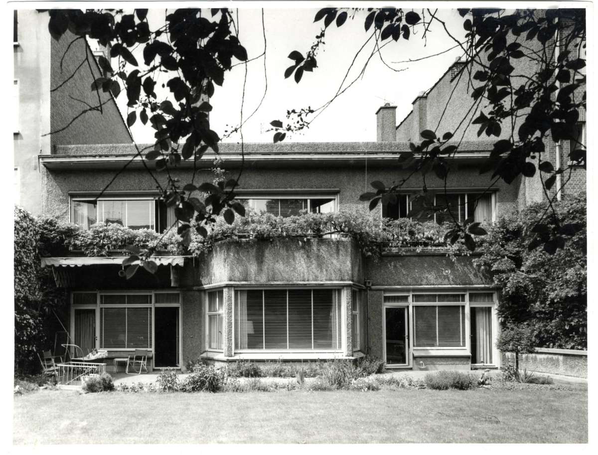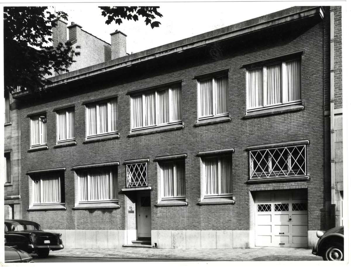 Habitation particulière construite en 1937 par l’architecte moderniste Jean-Jules Eggericx sur un plan classique, organisé autour d’un vide central sur deux niveaux et d’un escalier principal. Ce dernier a été partiellement refermé lors des travaux de transformation réalisés par l’architecte Depré en 1960. En façade rue, la seule modification par rapport à la situation d’origine est le remplacement de la porte de garage en bois, avec vitrages hauts et grilles, par une porte en PVC pleine. La belle façade arrière, revêtue d’enduit de ciment à la tyrolienne, présente encore quelques menuiseries en acier de 1938. Dans le volume existant, le projet restitue l’ouverture de l’escalier principal et modifie la distribution des pièces de service : cuisine plus vaste, vestiaire confortable, salles de bains modernisées. Une cage d’ascenseur prend place dans l’aéra secondaire. Elle permet d’accéder directement à un étage supplémentaire, construit en toiture et en retrait. Largement vitré, avec dépassant de toiture réduit au Nord et plus important au Sud, il s’inscrit dans la composition des façades d’origine.