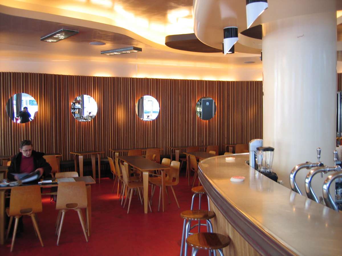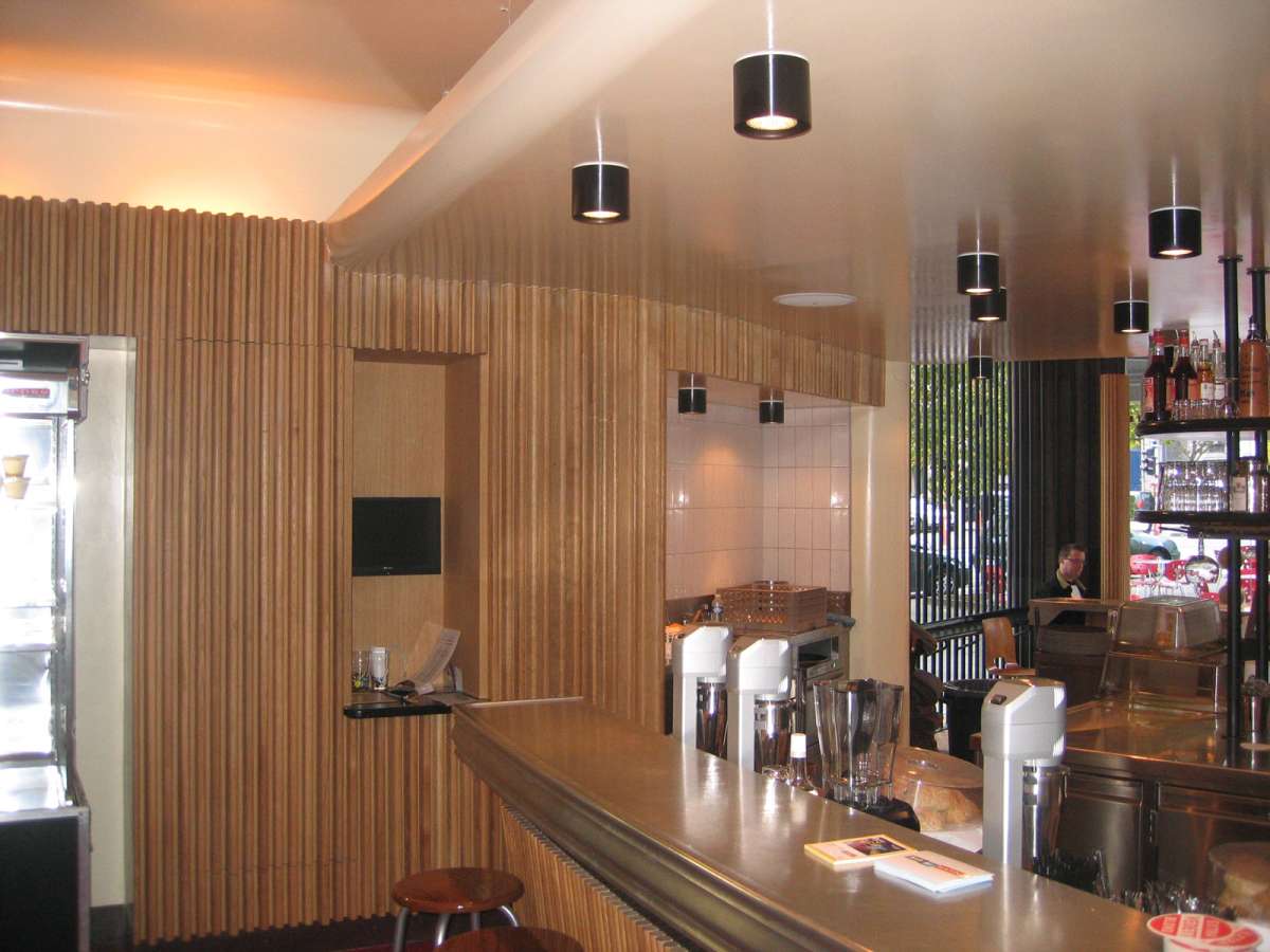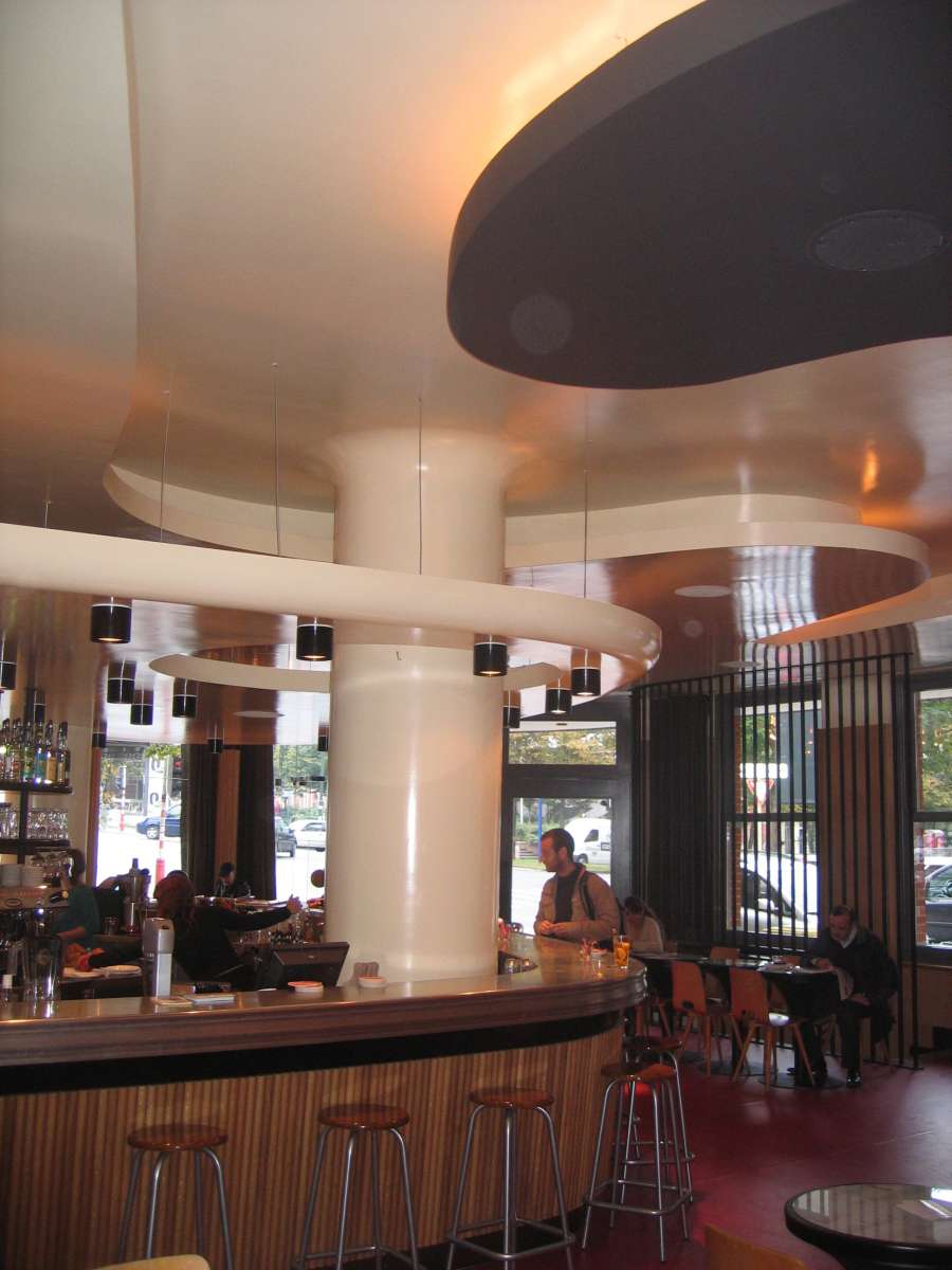 Construit vers 1900 en style éclectique, cet immeuble de rapport avec café et terrasse au rez de chaussée a subi une première transformation en 1912 avec la fermeture de la terrasse couverte. En 1989, une avancée en bois a été construite sur le trottoir, les châssis d’origine ont été remplacés par de nouvelles menuiseries en méranti et la façade polychrome a été recouverte d’une peinture blanche. Le projet comprend la restauration des façades – toitures, corniches, peintures des châssis – et la reconstruction de l’avancée du rez de chaussée. Volume entièrement vitré sous un auvent continu, le « Bar du Matin » s’organise autour d’un grand comptoir en étain aux formes arrondies auquel répond un plafond sculptural inspiré de l’oeuvre de Miro ; un auvent extérieur se déroule sur l’angle, rappelant la marquise métallique disparue vers 1960.