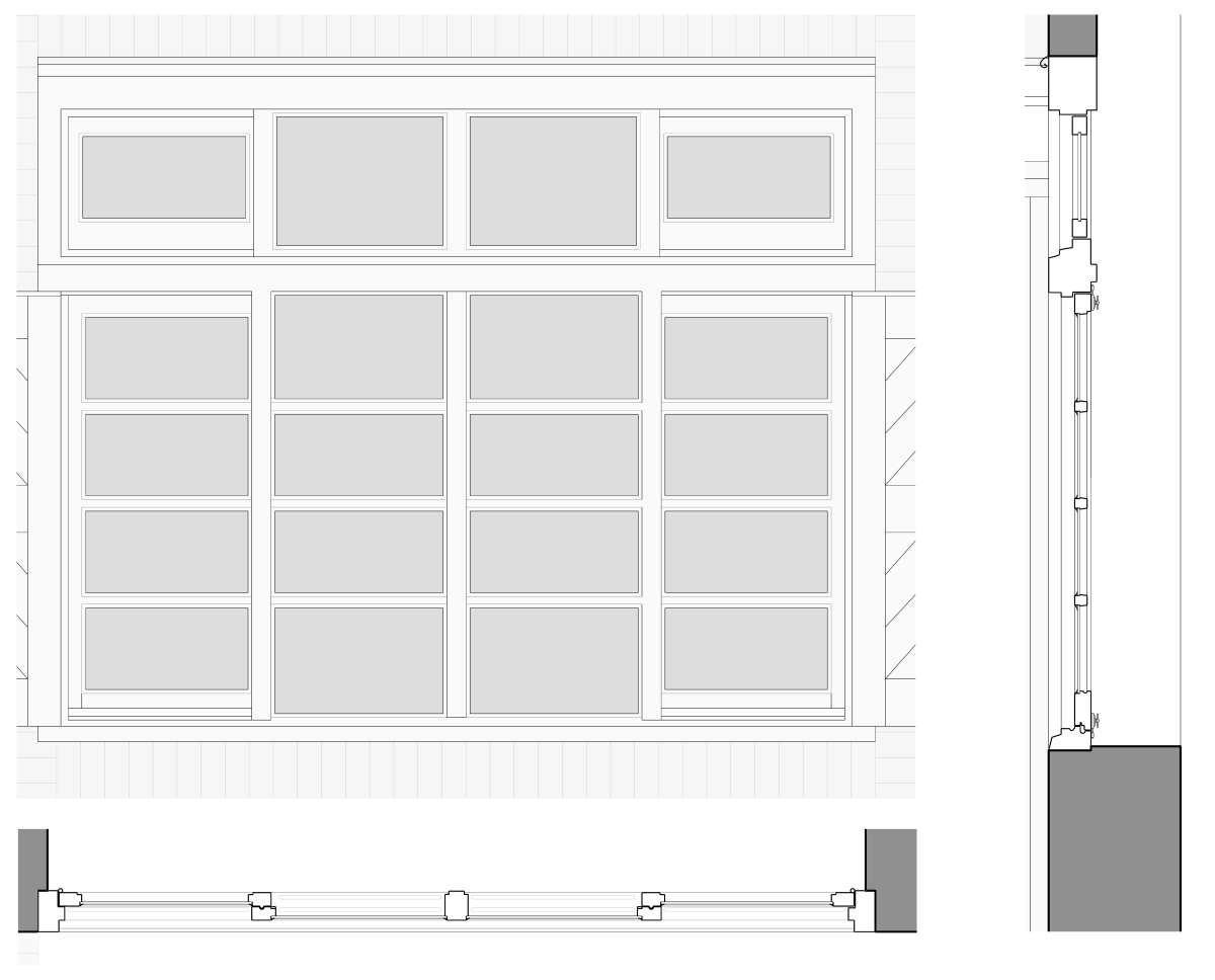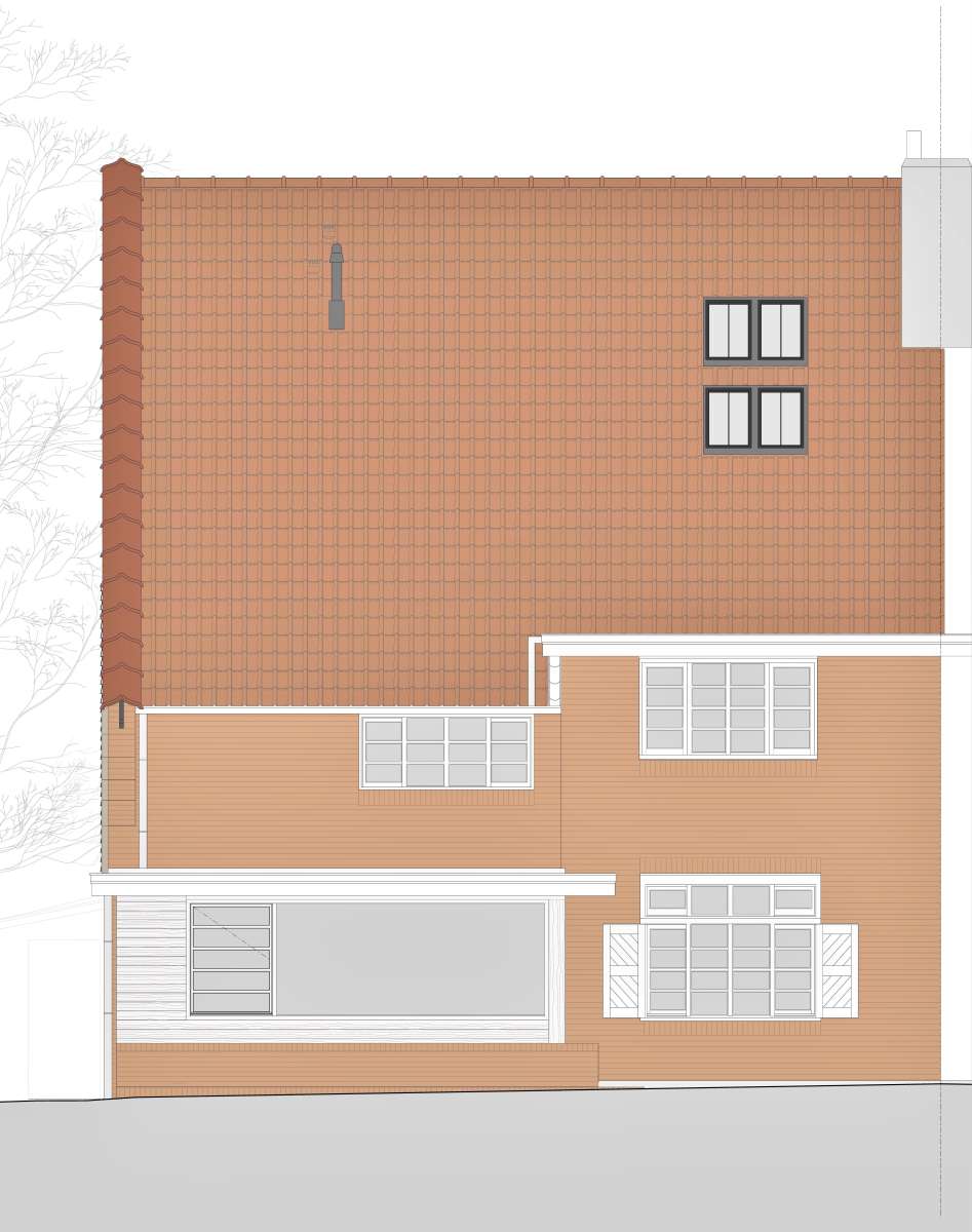 Le projet comprend en outre la restauration de l’ensemble des menuiseries extérieures d’origine, dans le respect des frappes à recouvrement mises au point par Pompe, incluant l’amélioration de leur performances énergétiques. L’habillage existant en fibro-ciment du pignon sera remplacé par un nouveau bardage en clins de mélèze laissé naturel, participant à l’intégration sobre et discrète du pignon dans l’environnement arboré de la maison, tout en renvoyant aux typologies mises en œuvre par Pompe dans plusieurs projets de la fin des années 1910 et du début des années 1920.