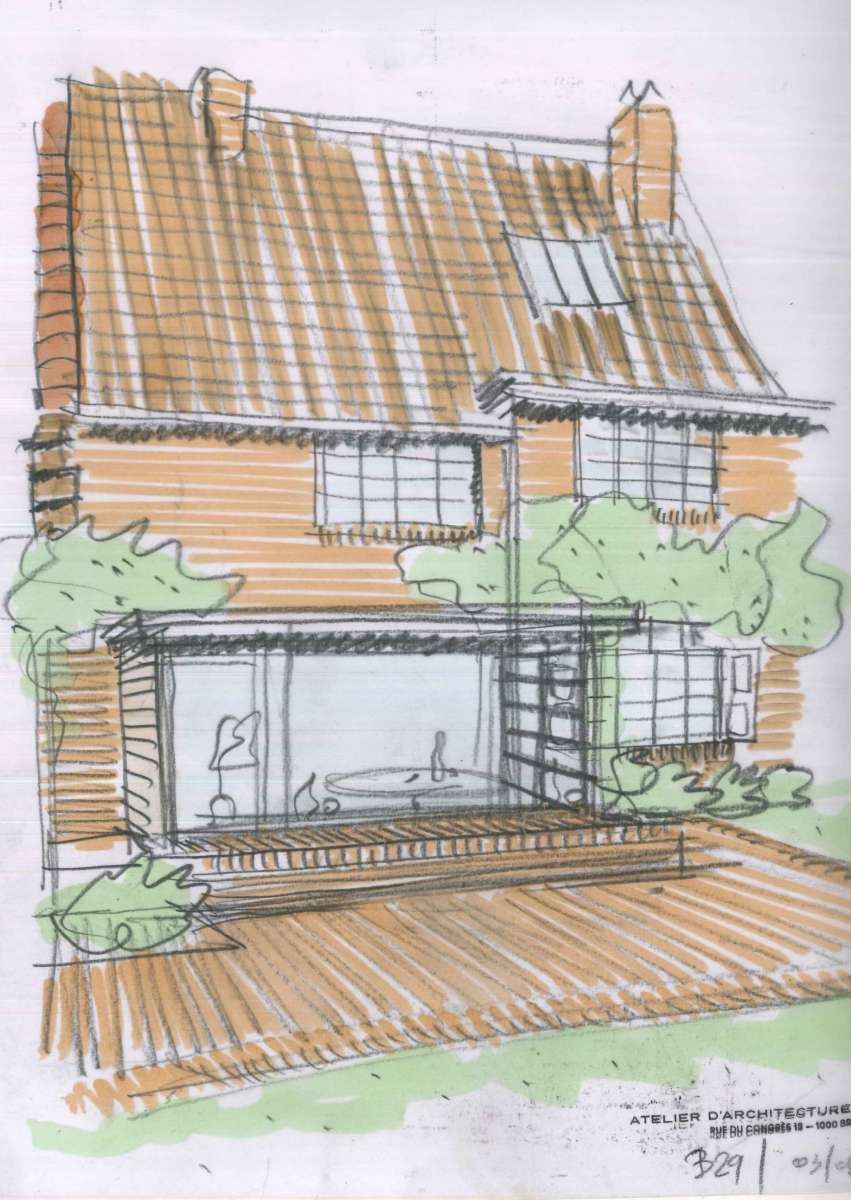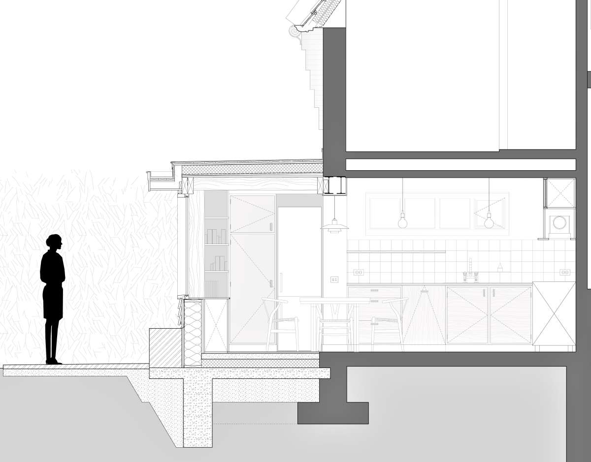 Si le plan originel de Pompe prévoyait la salle à manger, une modeste cuisine et une buanderie en façade arrière, l’ensemble a été modifié ultérieurement en réunissant la cuisine et la buanderie en un seul espace vers le jardin. Considérant la disparition de l’agencement originel du plan, le projet s’autorise une plus grande ouverture sur le jardin et propose une extension moderne couvrant ces deux travées altérées. Le nouveau volume est composé dans l’esprit de sobriété caractérisant le projet de Pompe : socle en maçonnerie, structure légère en bois avec bardage, ensembles vitrés à dominante horizontale et toiture plate à débordement.