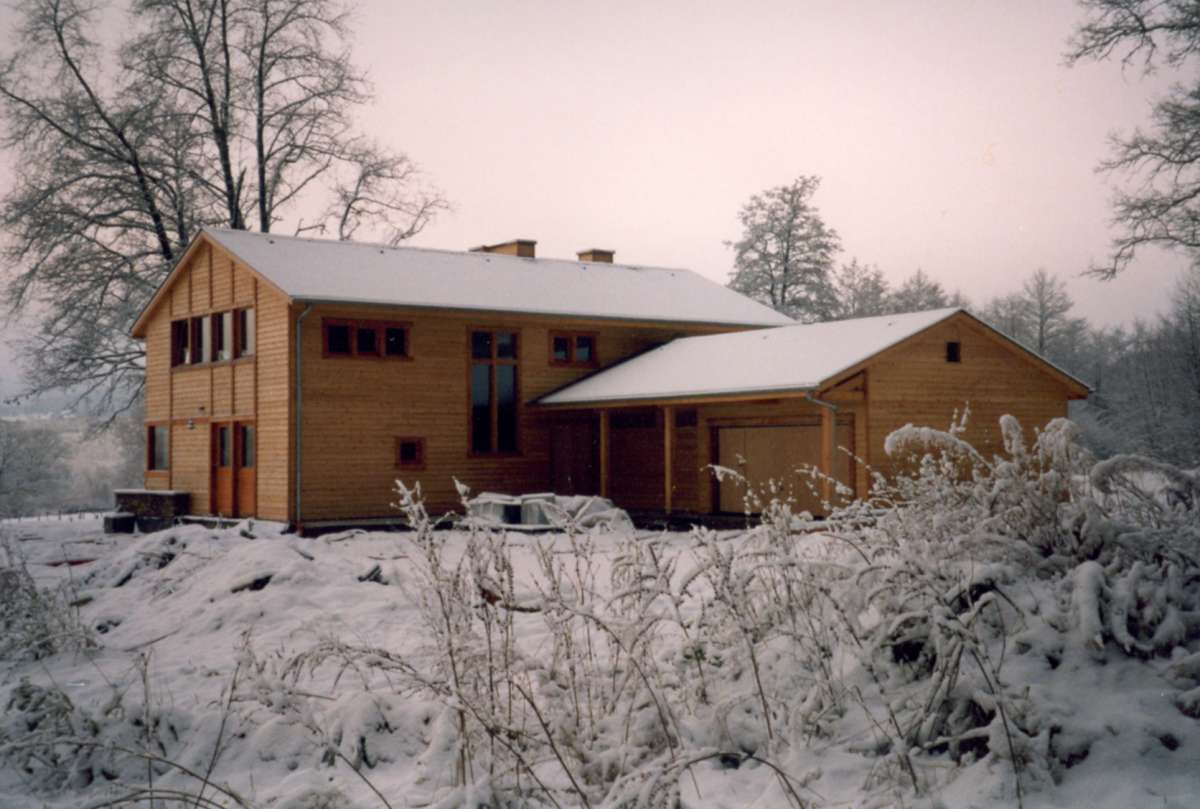 La volumétrie est inspirée de la typologie des fermes à auvents de la Vallée de la Lienne; le bardage en clins de thuya local et les cadres des baies en mélèze s’apparentent à l’architecture d’essentage de l’Ardenne Herbagère. L’implantation tire parti de la beauté du lieu; la maison est ouverte sur le paysage au levant et au Sud. A l’Ouest, un jardin plus intime borde un étang existant. Les nombreuses ouvertures sont calibrées en fonction de l’ordonnance intérieure et des vues sur le paysage voulues par les occupants. La distribution interne concilie le confort intimiste et la vie à la campagne. Tous les bois mis en oeuvre sont locaux et fournis par le maître d’ouvrage ; les différentes essences ont été réparties et assorties par pièces, leur conférant à chacune une ambiance particulière. La priorité a été donnée à la qualité d’exécution.