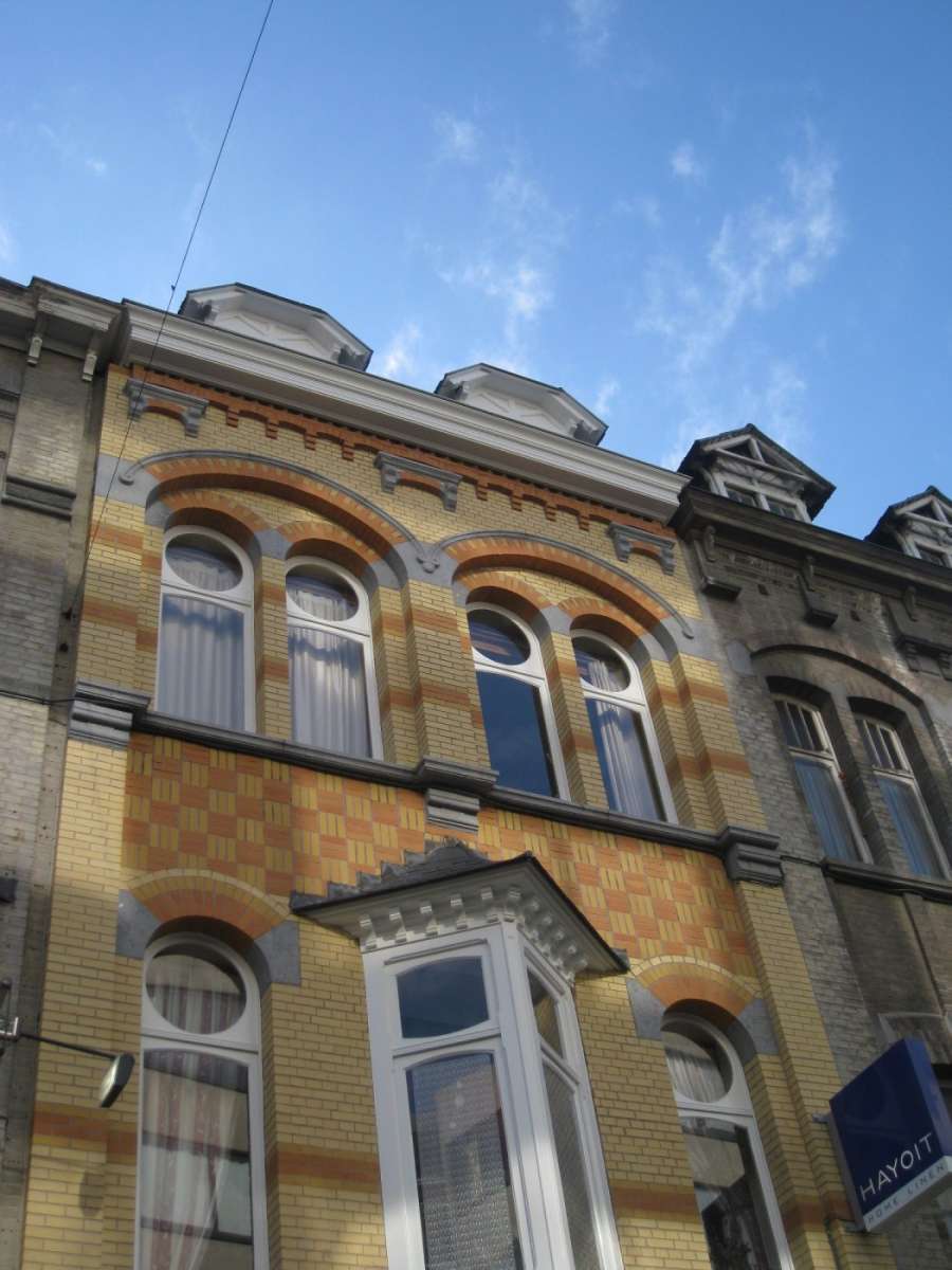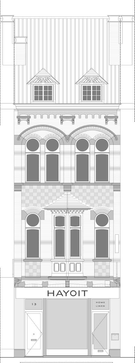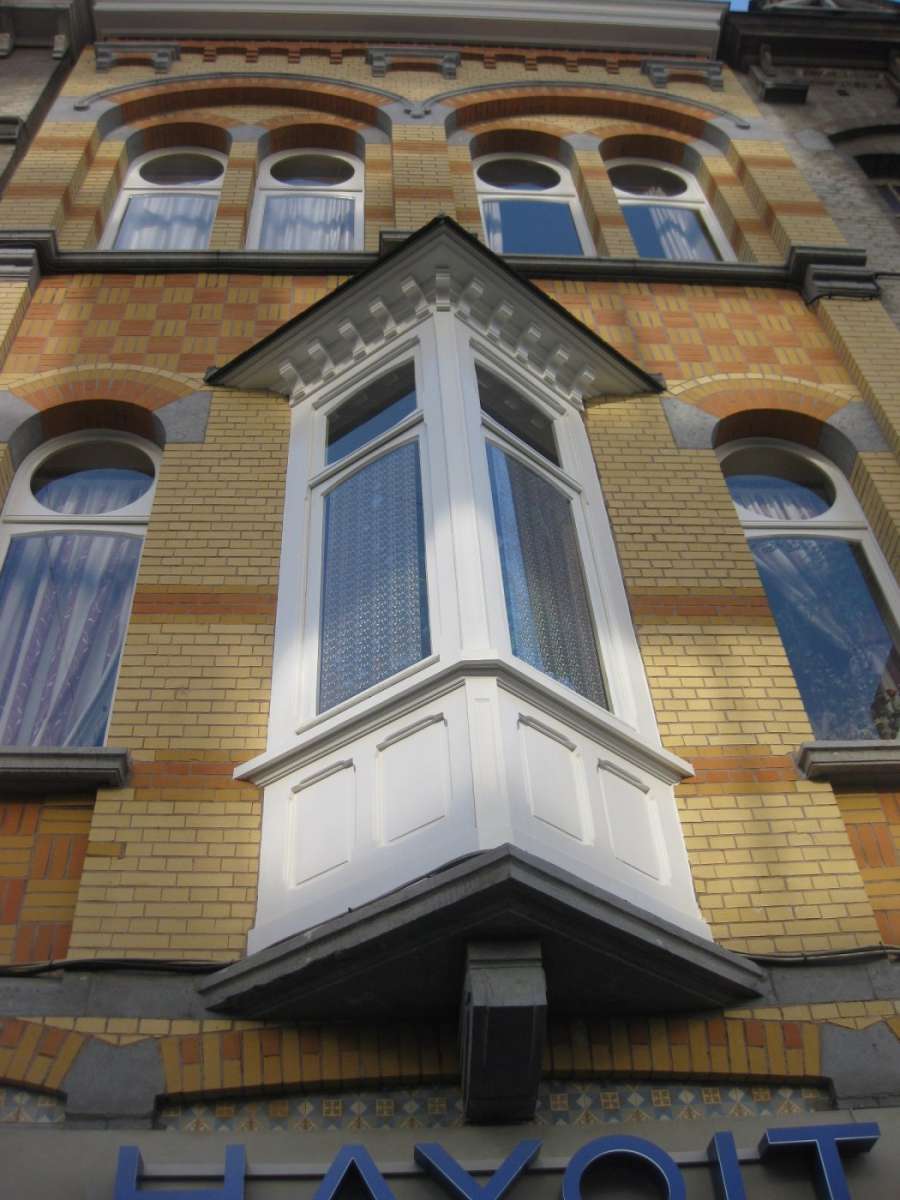 Restauration d’une façade Art Nouveau d’un petit immeuble de rapport avec rez commercial (Arch.Cochaux-Ségard 1909) situé dans le Quartier commercial de la rue des Tongres. Le rez de chaussée de l’immeuble a été complètement transformé vers 1960, puis en 1980 lors de l’aménagement d’un café. La façade de briques polychrome et les menuiseries particulières en bois nous sont parvenues par contre relativement intacts. Le rachat de l’immeuble et le projet d’aménagement d’un magasin de linge de maison « HAYOIT » au rez de chaussée sera l’occasion d’une restauration complète des façades et toitures. Compte tenu de la volonté communale de protection de l’ensemble architectural des rues Braffort et des Ménapiens, nous avons opté pour une composition symétrique au rez de chaussée qui respecte la façade de 1909, évite le pastiche et répond aux impératifs commerciaux de notre client.