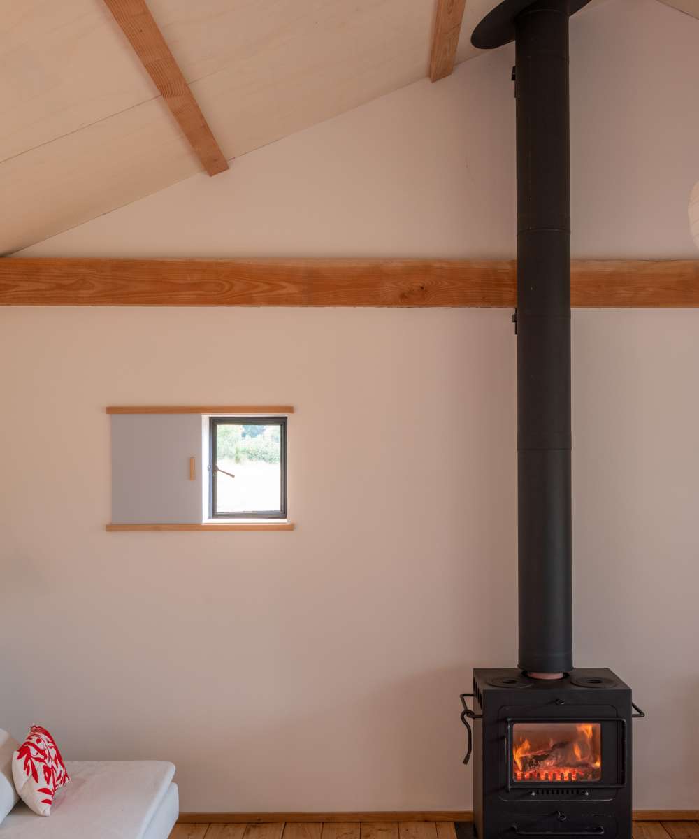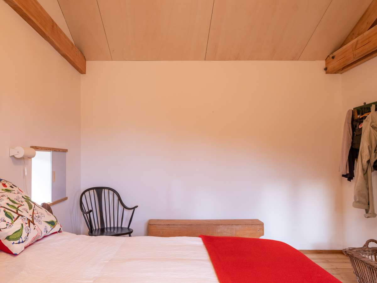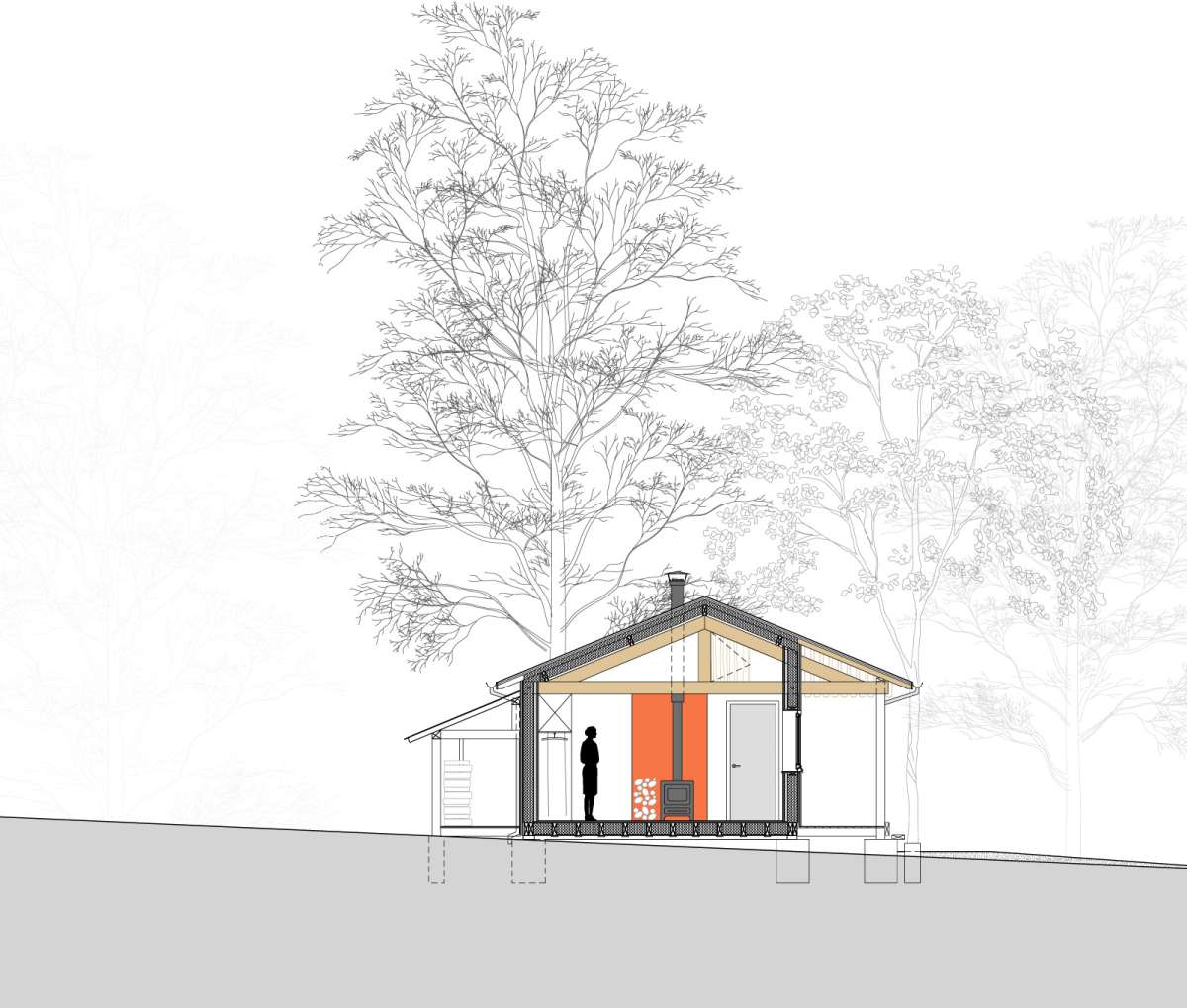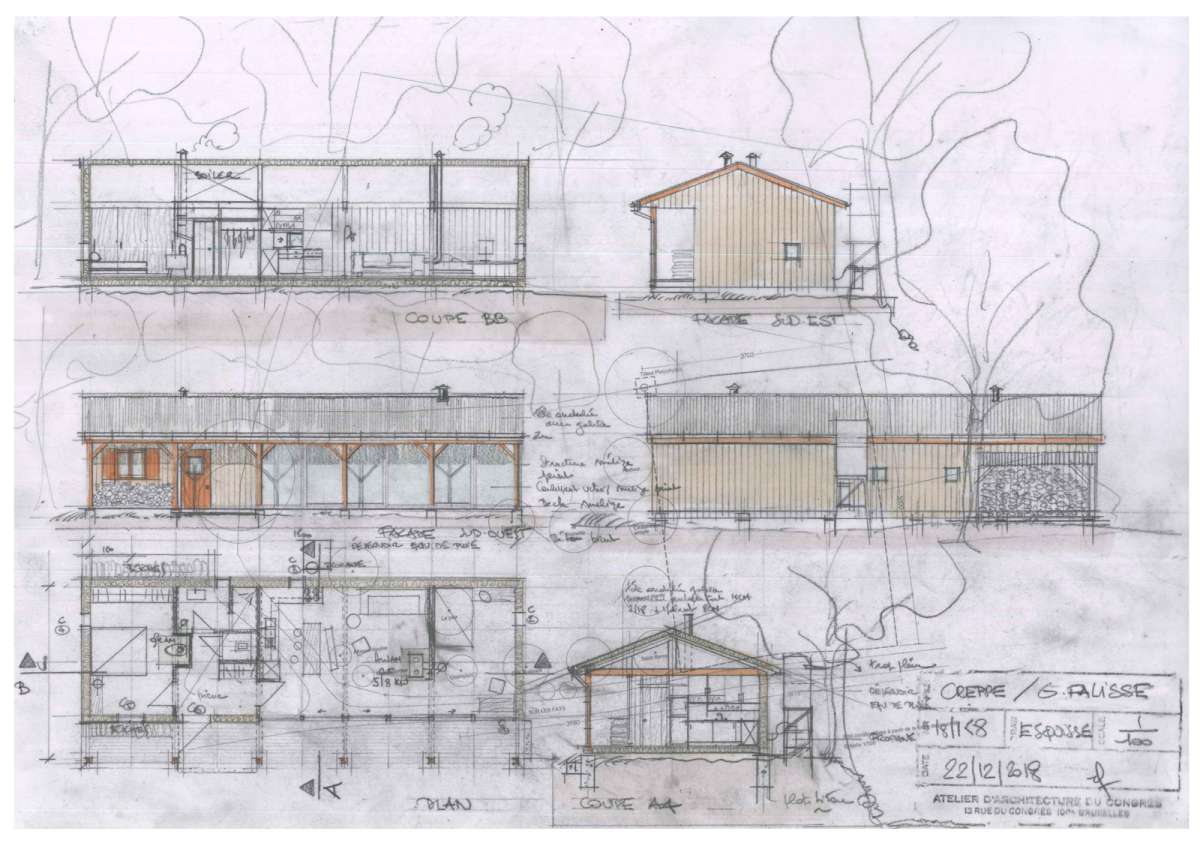 Dans un paysage herbager, sur une parcelle défrichée, petite retraite pour le week-end, pour y vivre simplement, dans un mode de fonctionnement et de consommation minimum. L’architecture se veut discrète dans le paysage, et adopte une volumétrie très simple issue des principes constructifs choisis. Implantée sur le haut et le plat du terrain, posées sur des plots de béton, elle ne génère que très peu de déblais et remblais. Le chauffage est au bois, ramassé ou coupé sur place ; deux poêles de masse performants et peu polluants, alimentés par une prise d’air extérieure, assurent une chauffe rapide en toute sécurité à l’occupant. La salle de bains bénéficie d’une récupération de chaleur à partir du poêle de la chambre.
