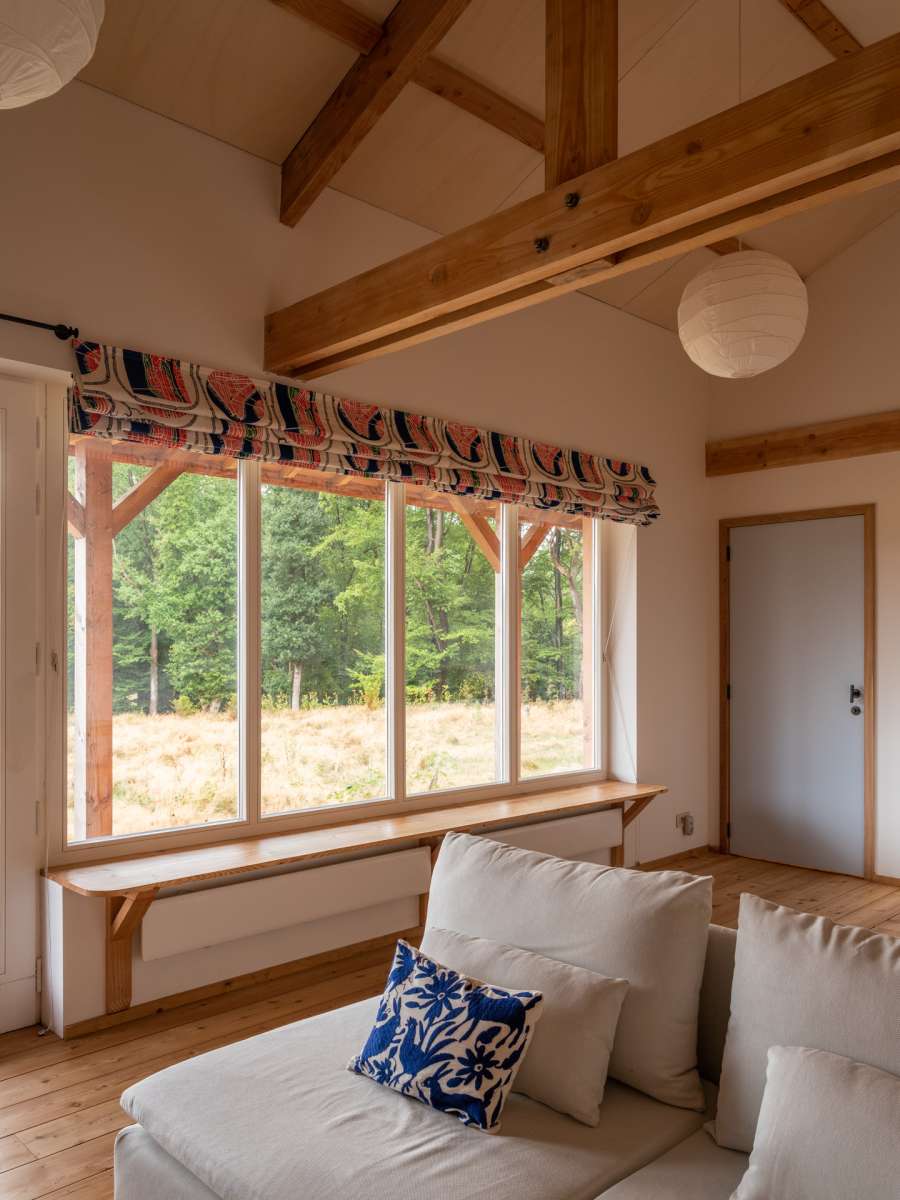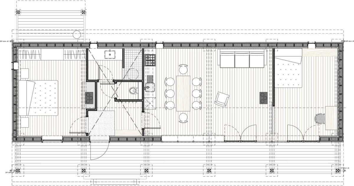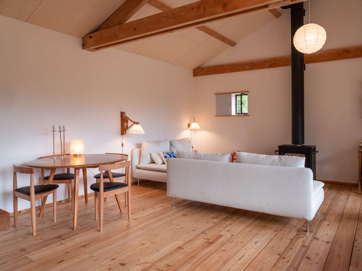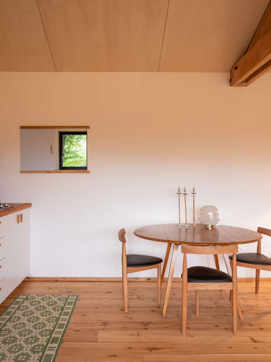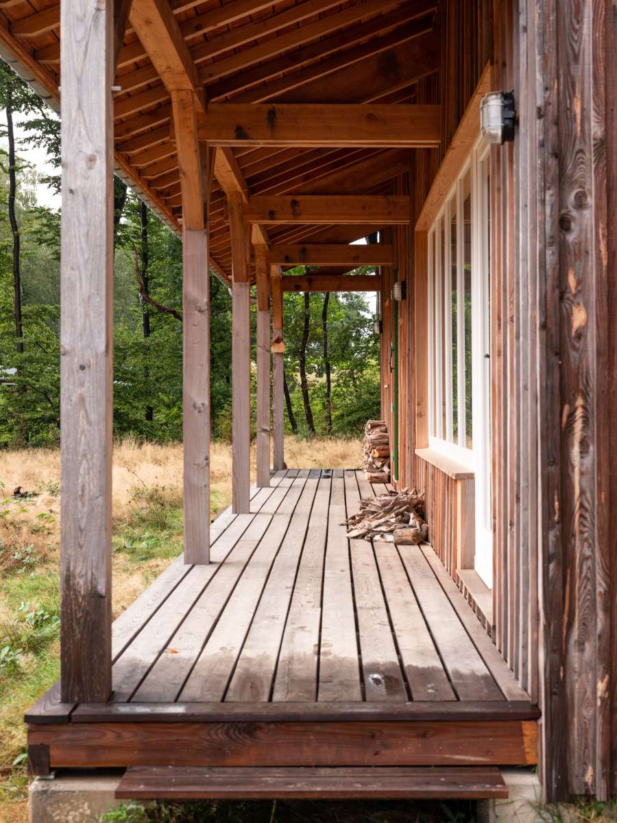 Dans un paysage herbager, sur une parcelle défrichée, petite retraite pour le week-end, pour y vivre simplement, dans un mode de fonctionnement et de consommation minimum. L’architecture se veut discrète dans le paysage, et adopte une volumétrie très simple issue des principes constructifs choisis. Implantée sur le haut et le plat du terrain, posées sur des plots de béton, elle ne génère que très peu de déblais et remblais. Le chauffage est au bois, ramassé ou coupé sur place ; deux poêles de masse performants et peu polluants, alimentés par une prise d’air extérieure, assurent une chauffe rapide en toute sécurité à l’occupant. La salle de bains bénéficie d’une récupération de chaleur à partir du poêle de la chambre.