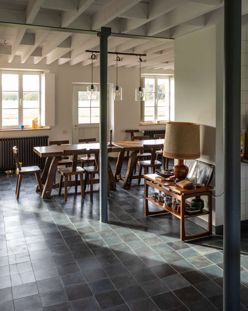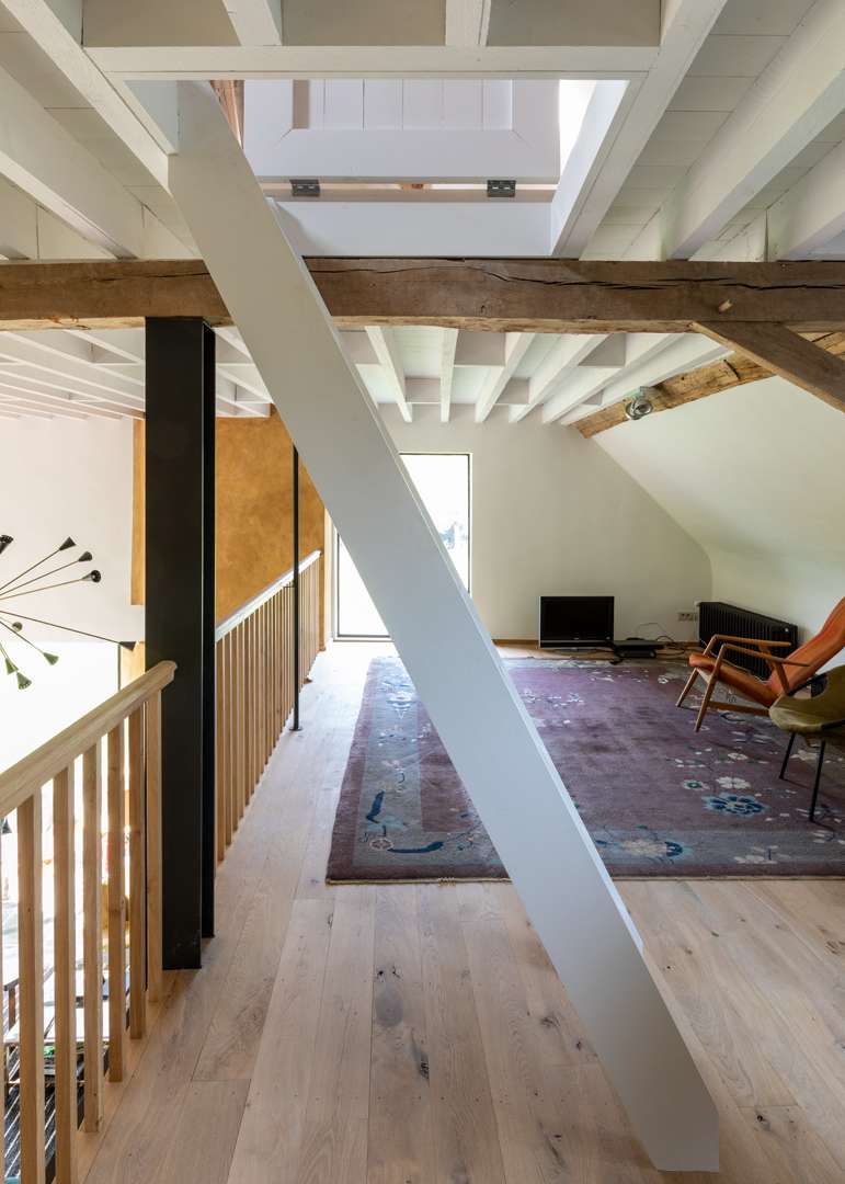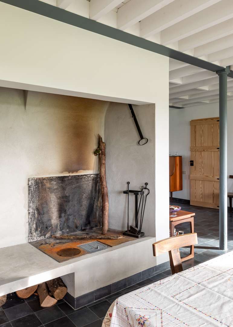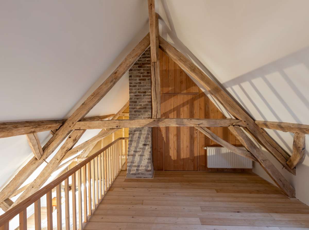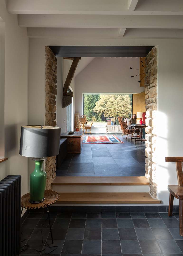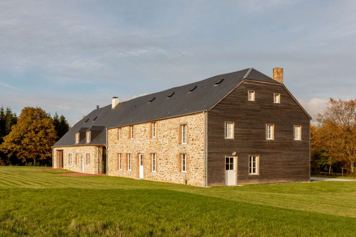 Ce grand volume typique de la Fagne Hennuyère a été construit en plusieurs phases, dont une surélévation de volume sous toiture à la fin du 19e siècle ; l’affectation agricole quasi continue jusqu’à nos jours a permis le maintien des structures d’origine, murs et charpente, et du passage charretier de la grange. Le projet de rénovation intègre le respect et la restauration des éléments encore en place – dont le logis au Sud encore récemment habité ou les charpentes en chêne – et privilégie le réemploi : colonnes en fonte de l’étable des années 1920, éléments structurels en bois, portes intérieures. Au Nord, un volume plus ancien converti en grange vers 1920 est aménagé avec modernité, de grandes ouvertures à linteau d’acier reprenant l’esprit des interventions agricoles du 20e siècle. Le confort thermique est atteint, mais dans le respect des éléments patrimoniaux, par l’utilisation d’isolants naturel – laine de bois, argile – en complément à l’inertie des murs de pierre.