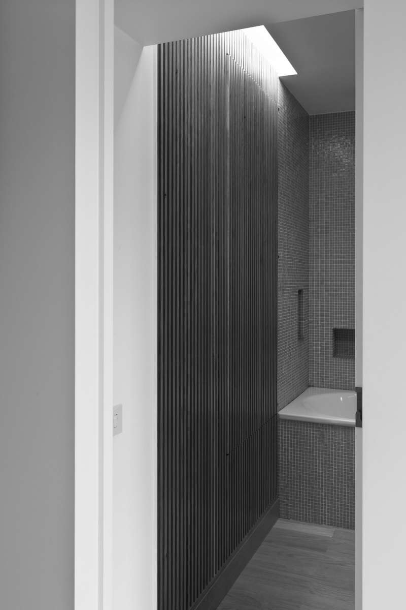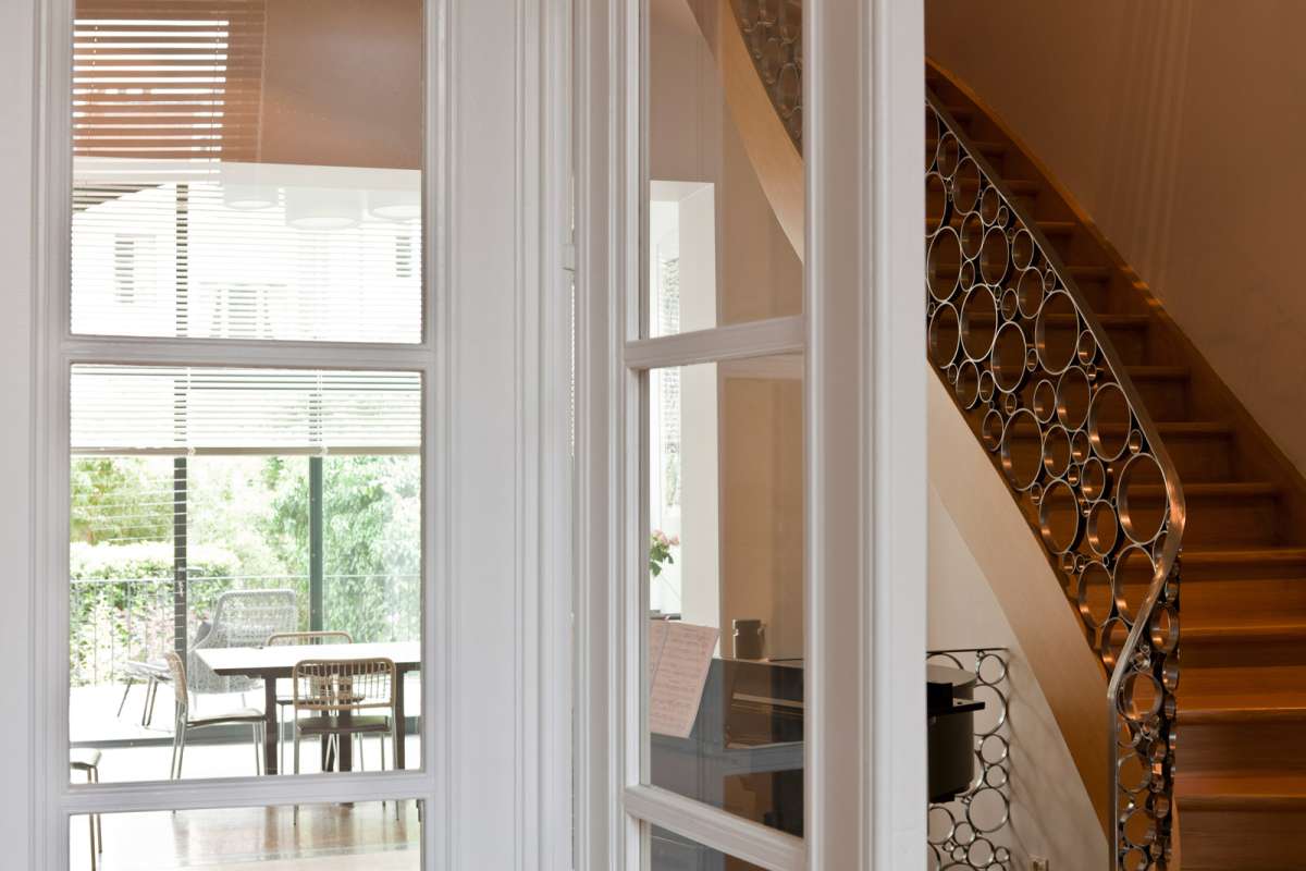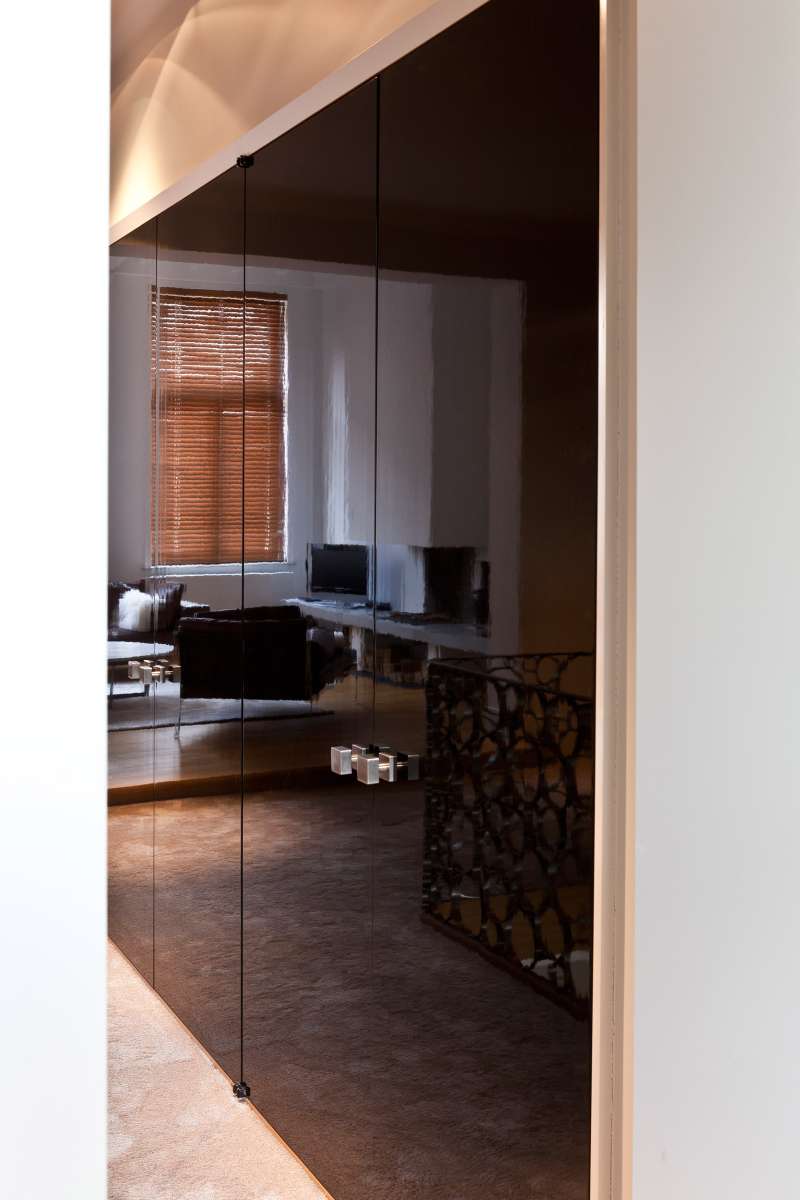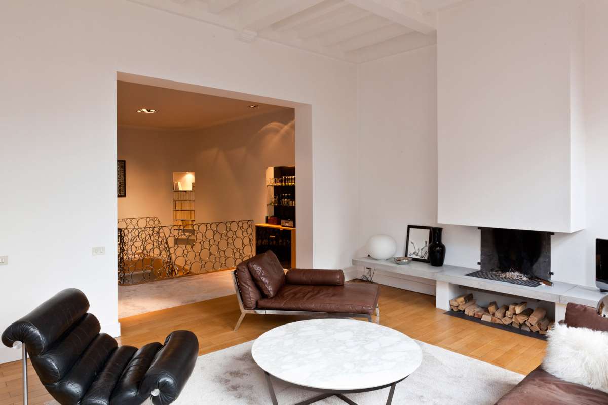 Habitation particulière de style éclectique teintée d'art nouveau géométrisant belge, modifiée vers 1940 par la création d'un garage en demi sous-sol et la transformation sauvage en appartements de petite taille vers 1980. Le projet vise à rétablir les espaces de réception des étages nobles par l'aménagement d'un triplex pour le propriétaire, organisé autour d'un escalier monumental implanté dans la pièce centrale des deux niveaux de l'enfilade, habituellement obscurs. Un duplex donné en location et une petite "suite d'amis" sont aménagés dans les étages supérieurs, indépendamment accessibles par l'escalier d'origine