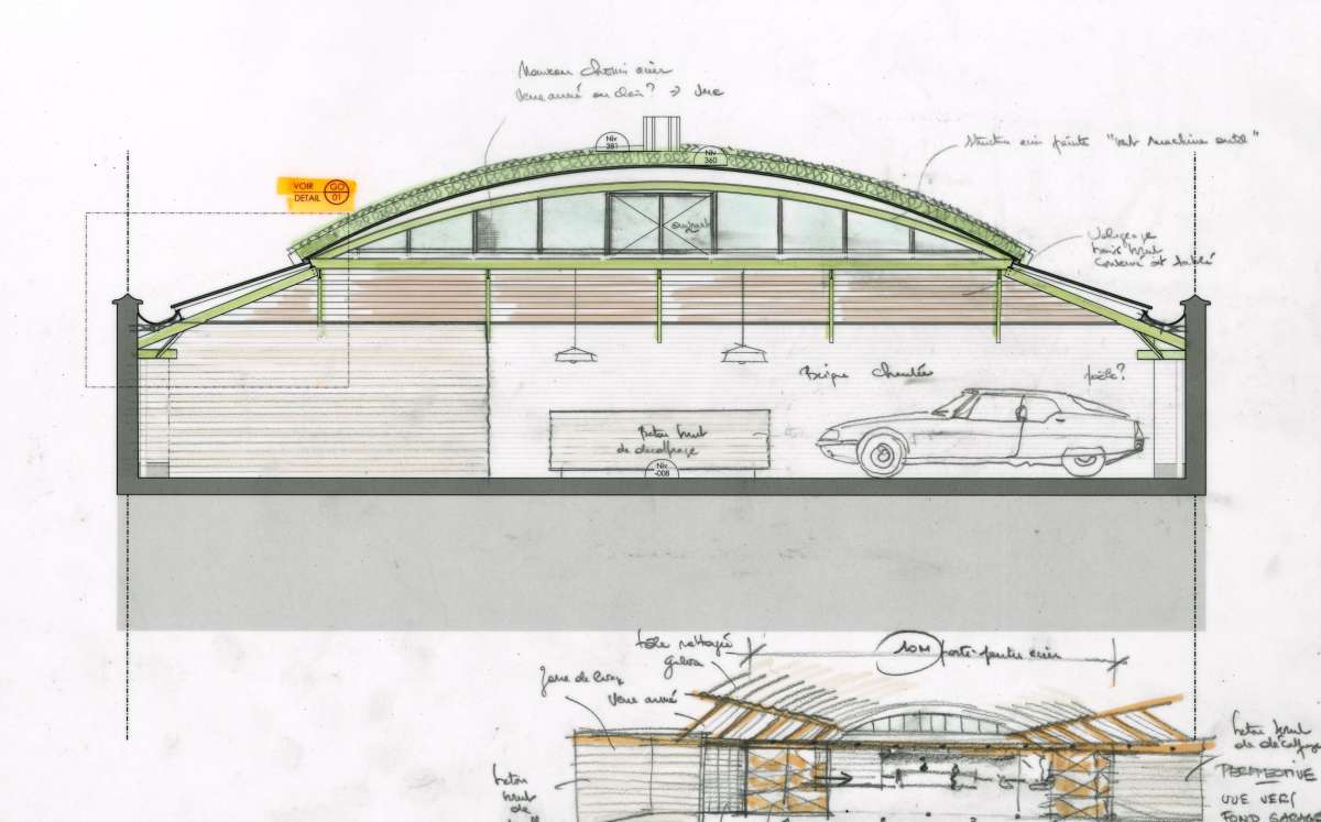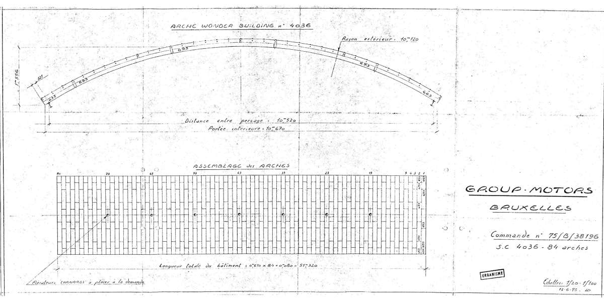 Garage conçu en 1949 par l’architecte tournaisien Gerard Renard pour la concession GENERAL MOTORS d’Ixelles, couvert par une structure métallique spectaculaire du modèle breveté et déposé SDG OMEGA. Cette charpente-couverture prenant appui sur des structures métalliques latérales permet une portée de plus de 15M libre de tout appui, réalisée avec une belle économie de moyen. Le projet prévoit le maintien et la vérification de la structure, la restitution des travées éclairantes en verre armé, le rétablissement du volume intérieur dans sa pureté d’origine, et le réaménagement complet de la partie à rue en bureaux, salles de réunion et de vente. Une attention particulière sera portée à l’isolation thermique du bâtiment par l’extérieur, qui permettra de retrouver la lecture des ondulations des tôles métalliques de l’intérieur du bâtiment.
