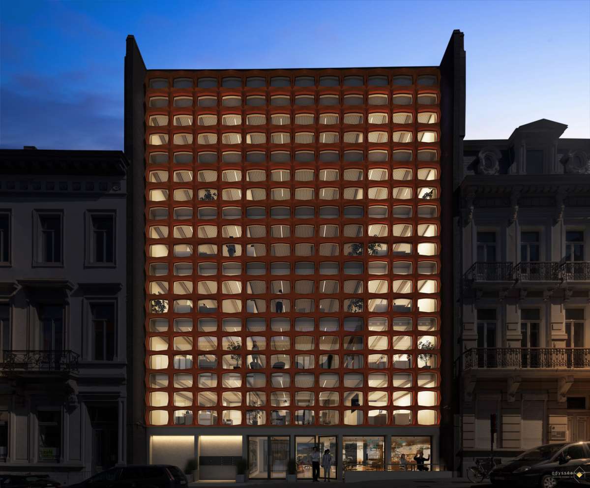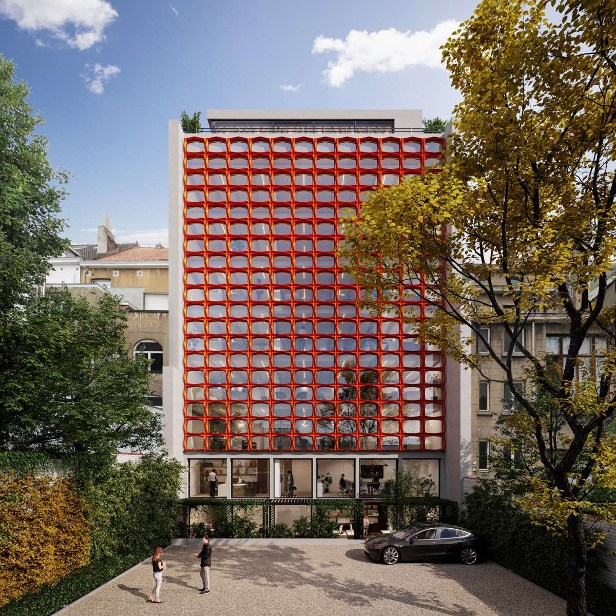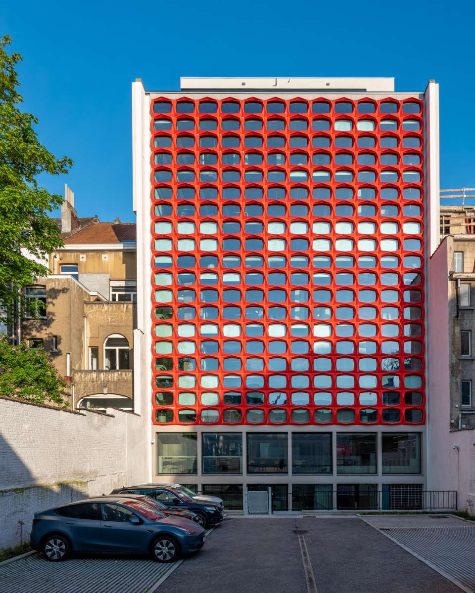 Rénovation d’un immeuble de bureau de 1964 conçu par les architectes Aerts et Ramon, première et unique application du polyester armé dans la construction de façade rideau en éléments préfabriqués. Le projet a permis la conservation et la restauration de la façade, le retour à la transparence originelle du rez de chaussée, la rénovation et la modernisation technique de l’immeuble de bureau dans le respect intégral de sa structure en béton armé, et son exhaussement par un nouvel étage en retrait. L’actuel parking est partiellement déminéralisé, planté d’un arbre haute tige et végétalisé.