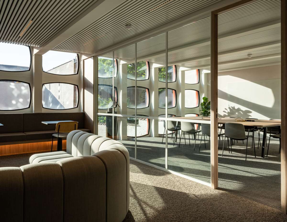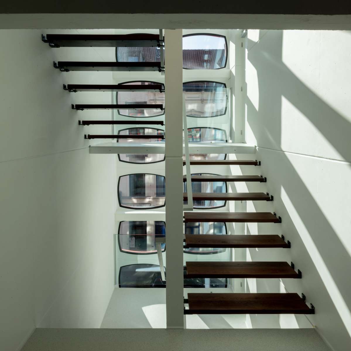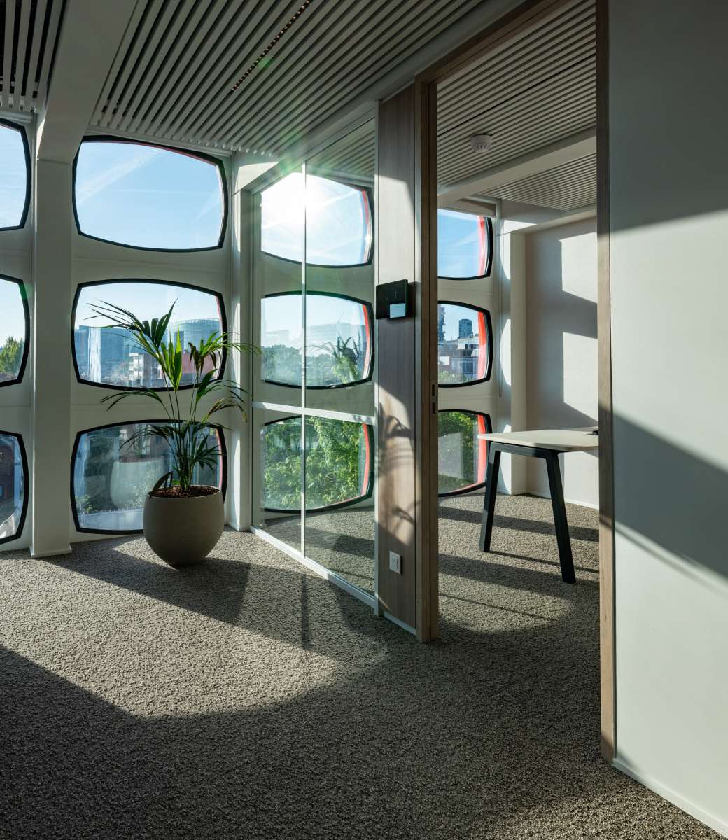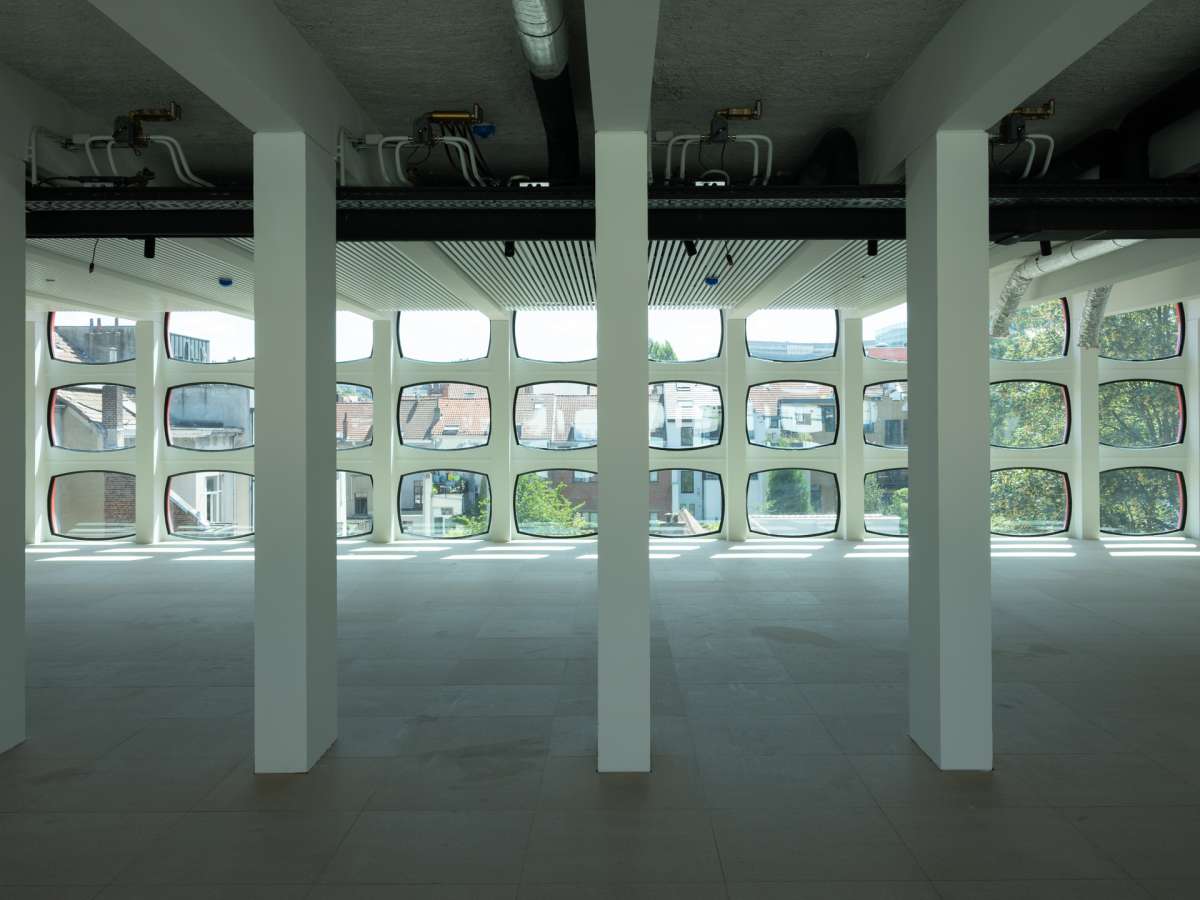 Rénovation d’un immeuble de bureau de 1964 conçu par les architectes Aerts et Ramon, première et unique application du polyester armé dans la construction de façade rideau en éléments préfabriqués. Le projet a permis la conservation et la restauration de la façade, le retour à la transparence originelle du rez de chaussée, la rénovation et la modernisation technique de l’immeuble de bureau dans le respect intégral de sa structure en béton armé, et son exhaussement par un nouvel étage en retrait. L’actuel parking est partiellement déminéralisé, planté d’un arbre haute tige et végétalisé.