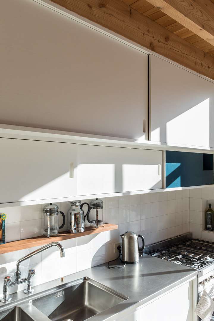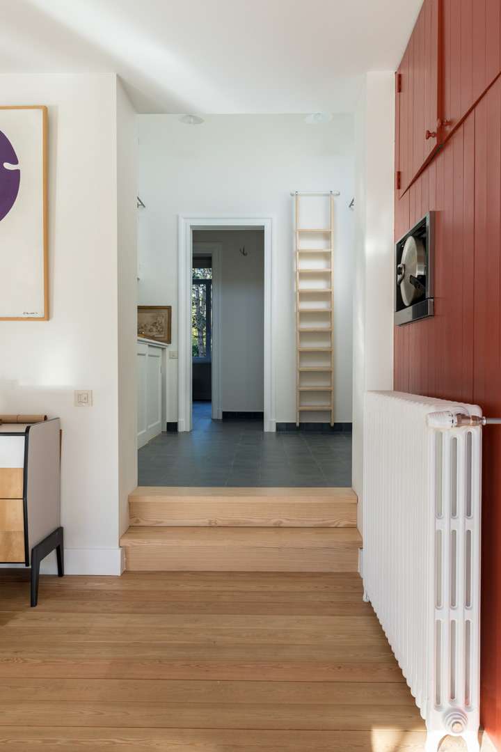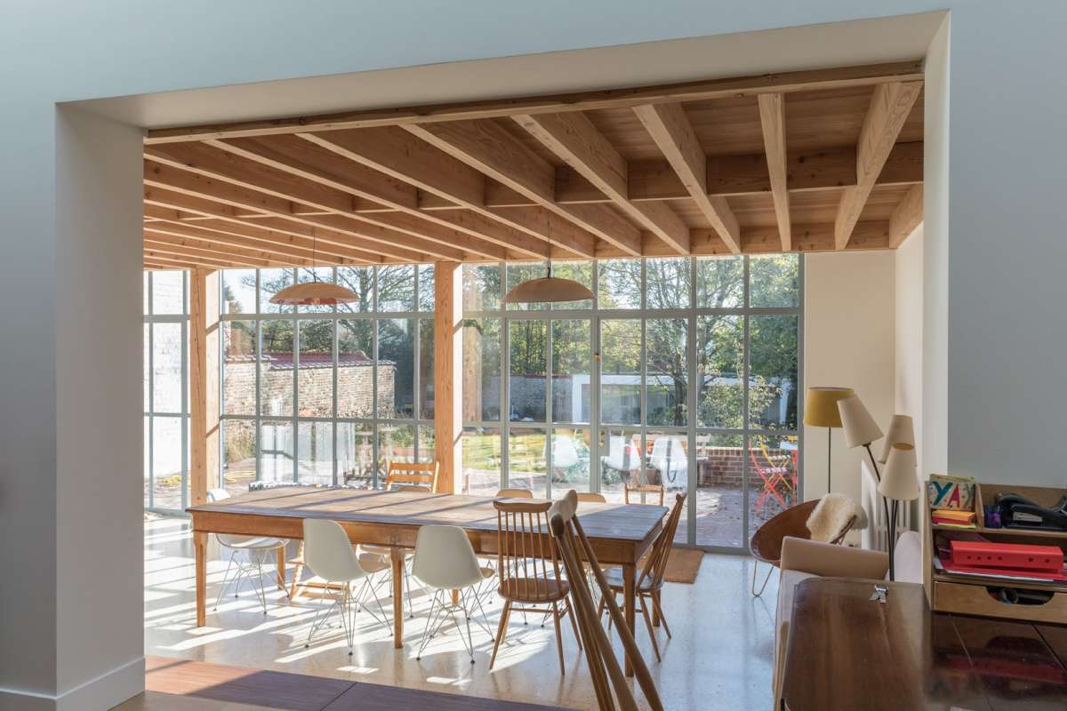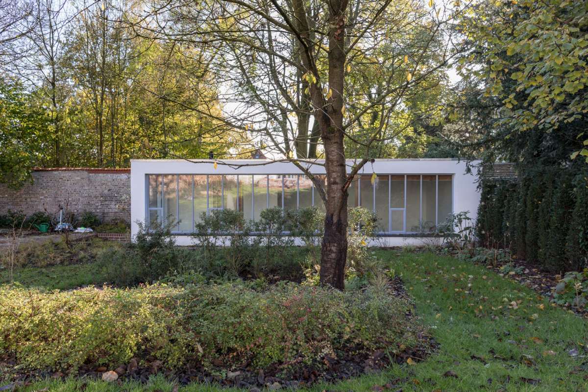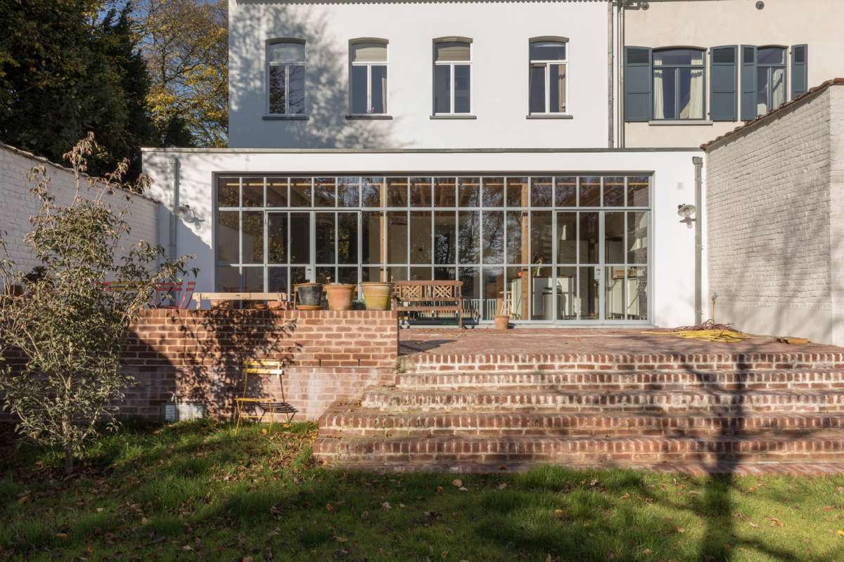 Maison néo-classique de 1880, altérée au cours du temps, augmentée de deux travées vers 1900, l’escalier latéral en bois prenant une position centrale. La façade avait été alors enduite, et les baies de fenêtres garnies de moulures et clés, le tout dans un esprit néo-classique finissant, en rupture avec le style pittoresque caractéristique de Boitsfort. Le projet a permis de redonner à cette maison une unité architecturale, tant par la nouvelle extension que par le remaniement des espaces intérieurs. L’escalier, hérité de l’ancien plan d’avant 1900, étriqué et mal placé, a été déplacé. Les salons conservent leur affectation, mais bénéficient d’un éclairage zénithal à l’arrière ménagé dans le volume de la saillie existante. L’extension occupe toute la largeur de la façade arrière, couverte d’une structure bois apparente et fermée par un ensemble en acier vitré. Une verrière en acier et des fenestrons hauts assurent l’éclairage des pièces arrière du volume principal. En fond de parcelle, un nouvel atelier répond à l’extension de la maison.