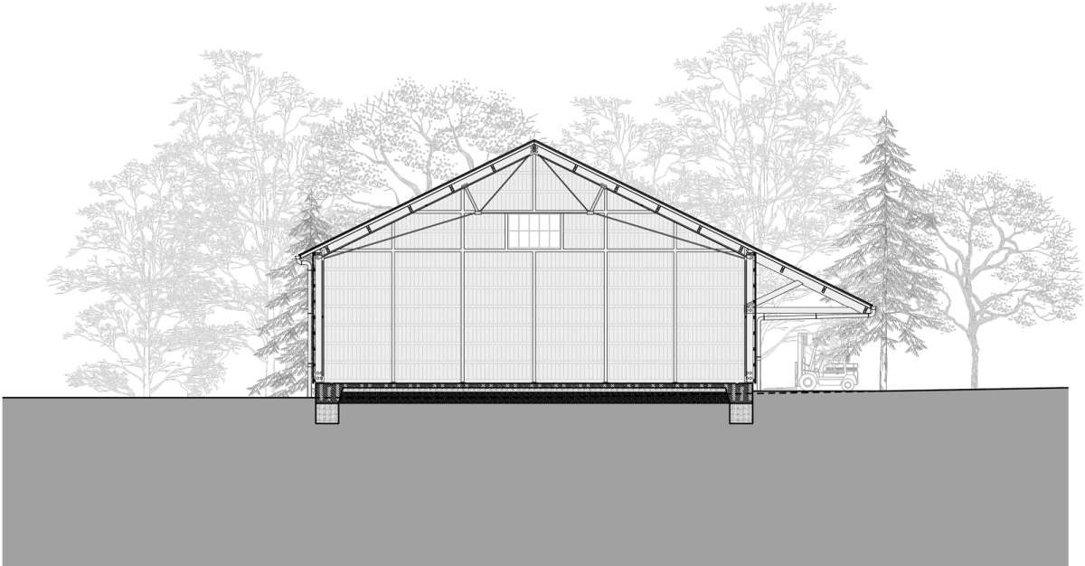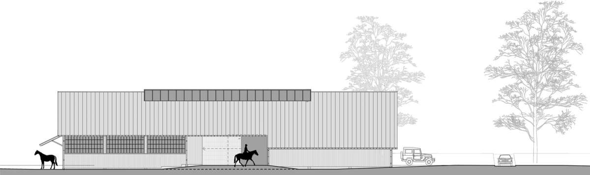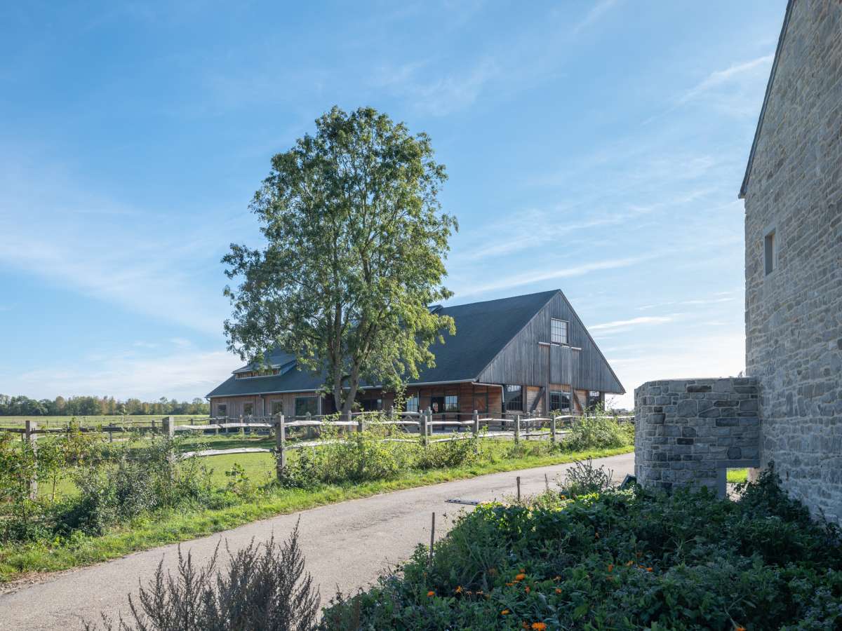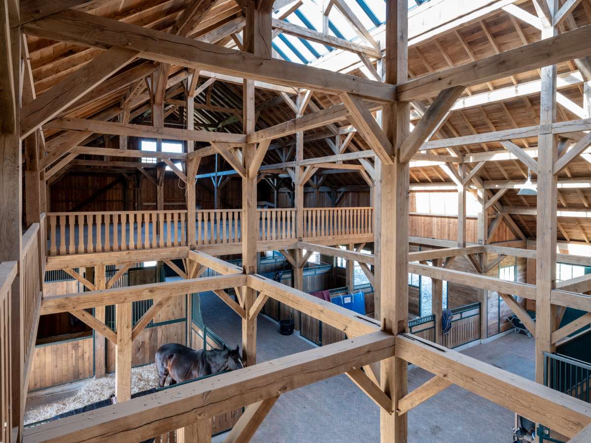 Implantées à l’endroit d’anciens hangars métalliques, les écuries présentent une charpente en chêne assemblée traditionnellement; la pente de toiture importante permet la création d’un fenil aux étages et d’autres fonctions complémentaires à l’élevage des chevaux. Le hangar agricole et la piste couverte sont à ossature acier apparente et structure secondaire en résineux indigène massif, avec de grandes verrières ouvrant des vues sur la campagne. Isolations optimales en matériaux naturels, réserves importantes d’eau de pluie et fonctions intégrées à la nature font de ce projet une tentative d’intégration d'une architecture agricole actuelle dans le paysage.