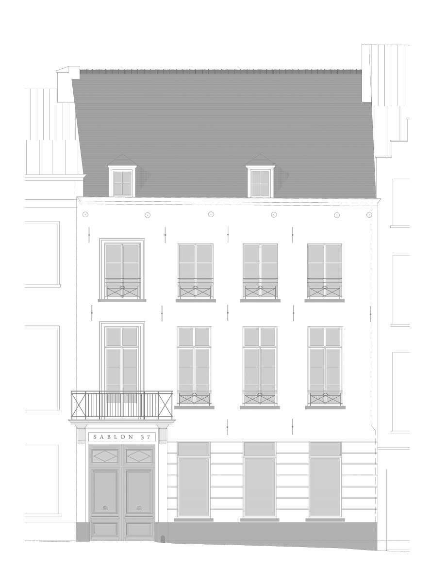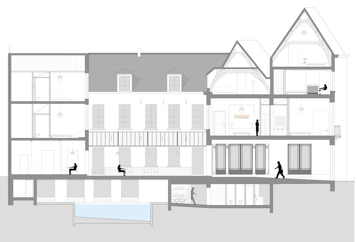 Le projet prévoit la réaffectation de l’immeuble en hôtel avec rez-de-chaussée commercial et Horeca, avec une attention particulière accordée à la restauration et restitution des éléments patrimoniaux remarquables : façades, charpentes des XVIIe-XVIII siècles, menuiseries extérieures, caves voûtées, escalier baroque en chêne et colonne Empire de l’ancien passage cocher, tout en améliorant les performances énergétiques et de confort du bâtiment.