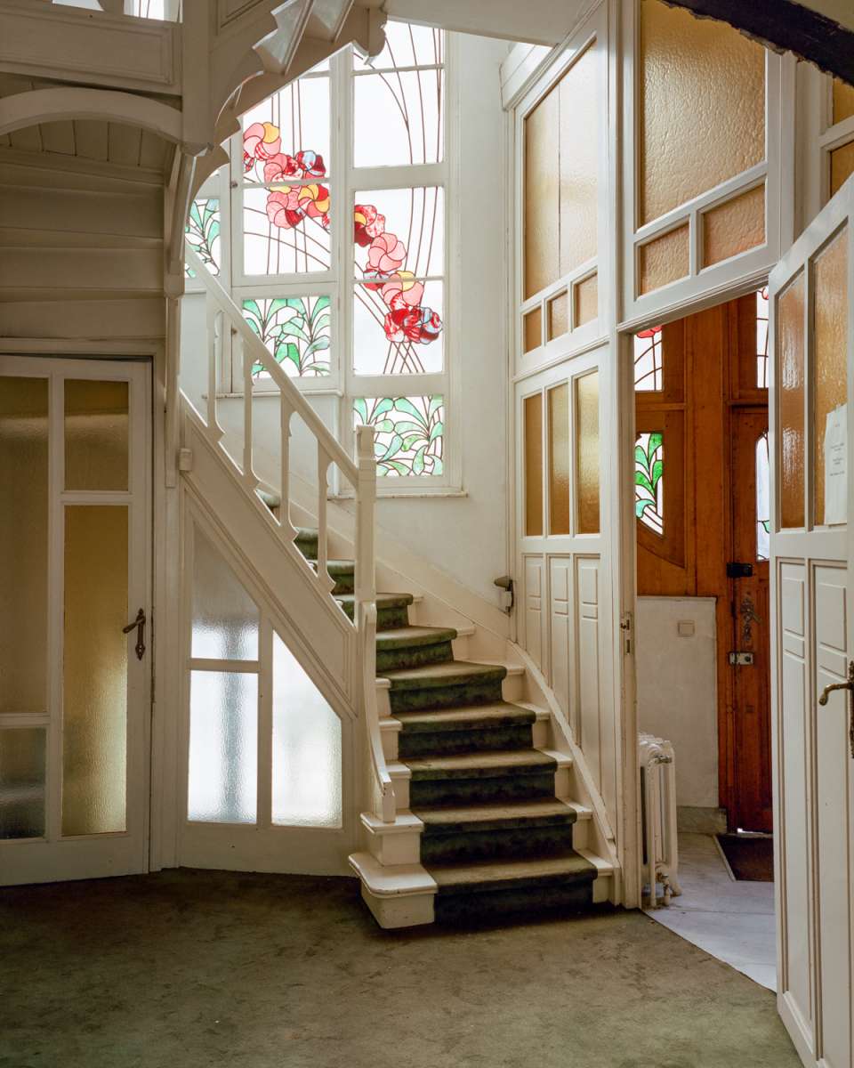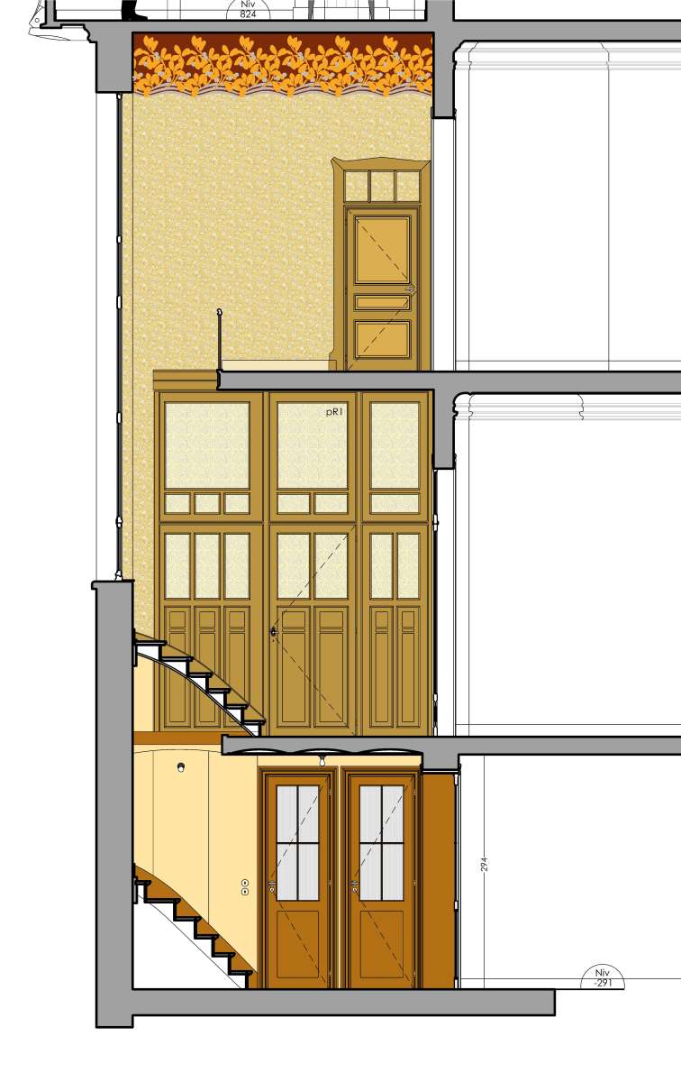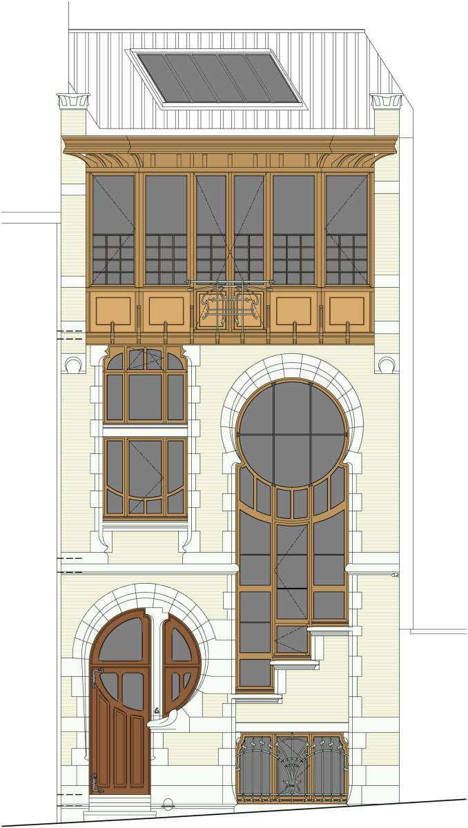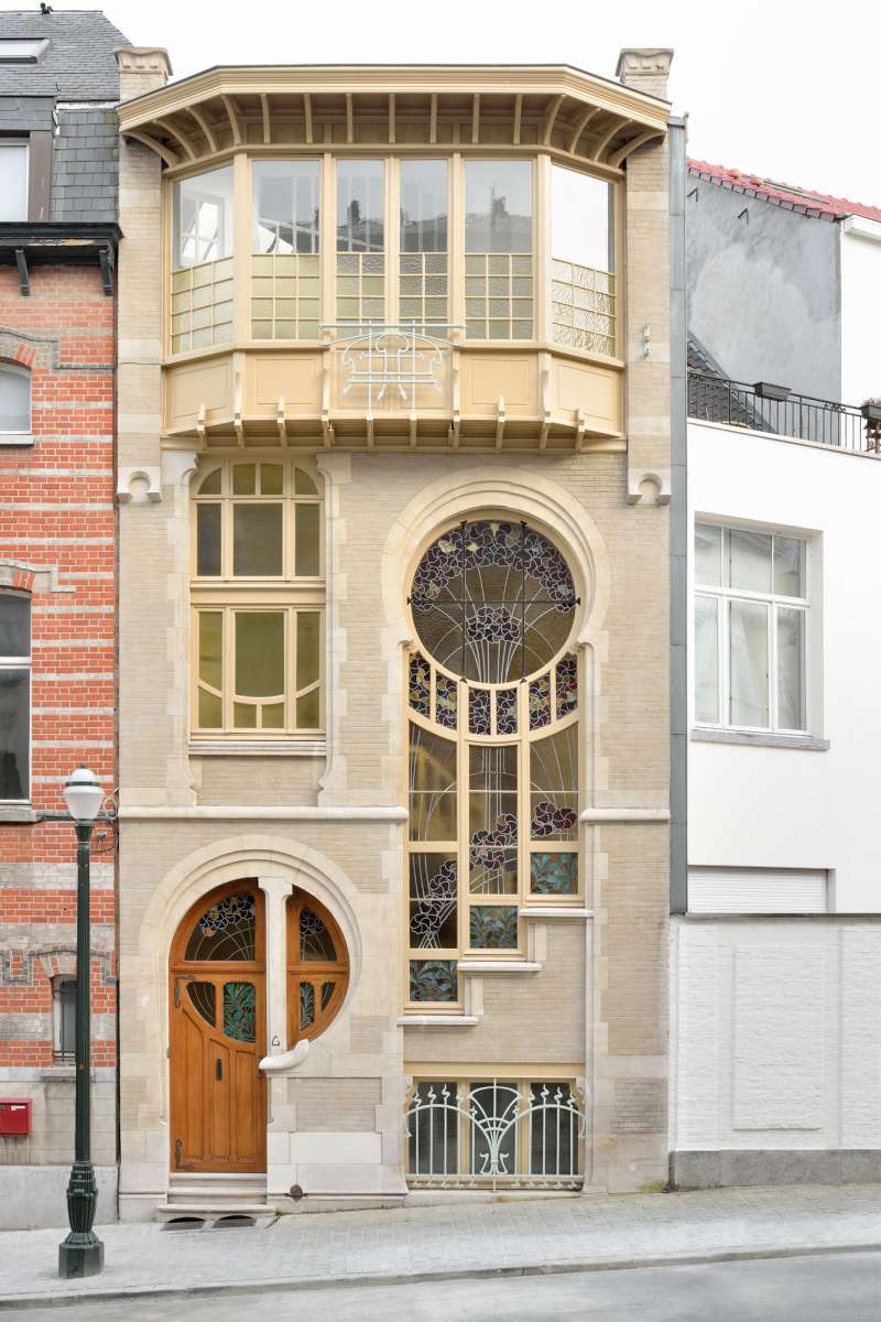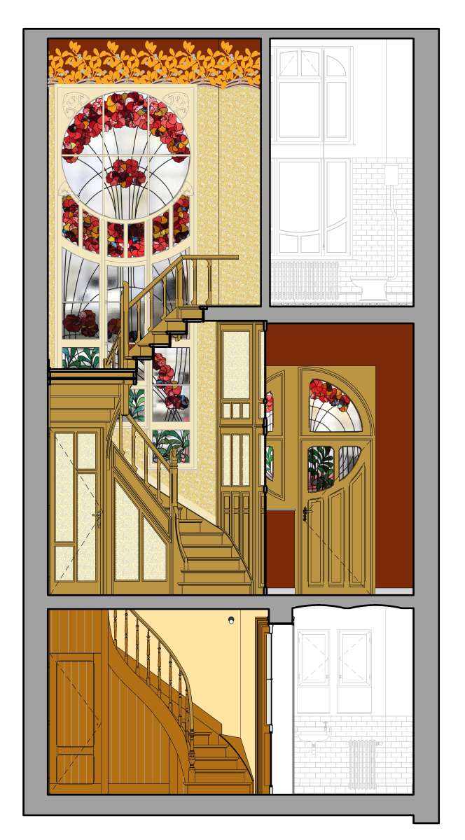 Le caractère particulier de cette maison construite par l’architecte Ernest Delune en 1893 dans un style éclectique, puis transformée partiellement en 1902 en style Art Nouveau géométrisant, réside dans la cohabitation de deux styles à la fois différents et complémentaires, œuvre d’un même architecte pour un client à deux faces, à la fois huissier de justice et artiste-peintre. La restauration porte sur la construction d’origine, allant jusqu’à la restitution pour certains éléments perdus, et sur les transformations plus remarquables de 1902. Les interventions de 1948 sont maintenues dans leurs grandes lignes, car elles s’inscrivent logiquement dans les modifications de circulation apportées en 1902. Les altérations intérieures de 1977-78 ont été en grande partie supprimées, grâce au rétablissement des circulations et des espaces de 1893/1902. Le salon du rez de chaussée, vaste pièce obtenue en 1902 par le déplacement de l’escalier, a été rétabli dans son volume par la démolition complète de l’escalier hélicoïdal et des cloisons de 1978. L’ancienne annexe de 1893, intégrée dans l’extension de 1902, a retrouvé sa fonction de pièce sanitaire et la cage d’escalier centrale a été restituée avec son escalier à deux volées. Les seconds jours, observés sur le relevé de l’architecte Vranckx de 1977, ont été réouverts et équipés de châssis intérieurs en bois peint et verre étiré. La restauration complète de la cage d’escalier de 1902 et de son vitrail spectaculaire a fait l'objet d’une seconde campagne de travaux.