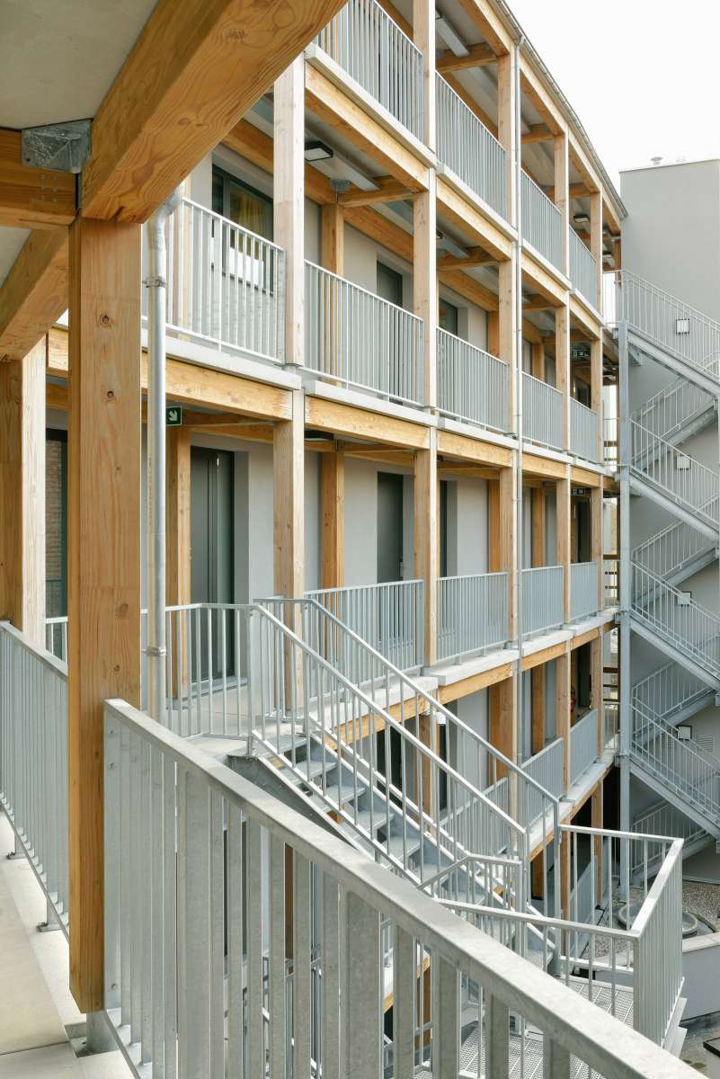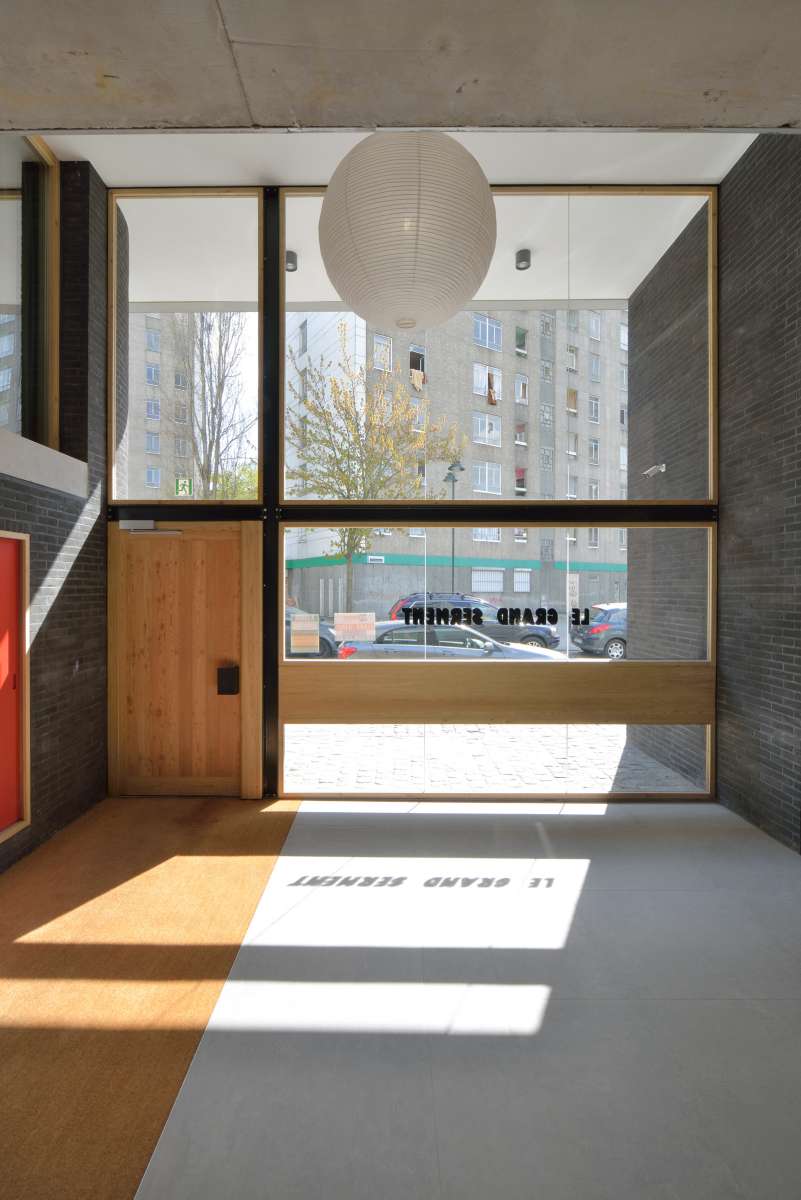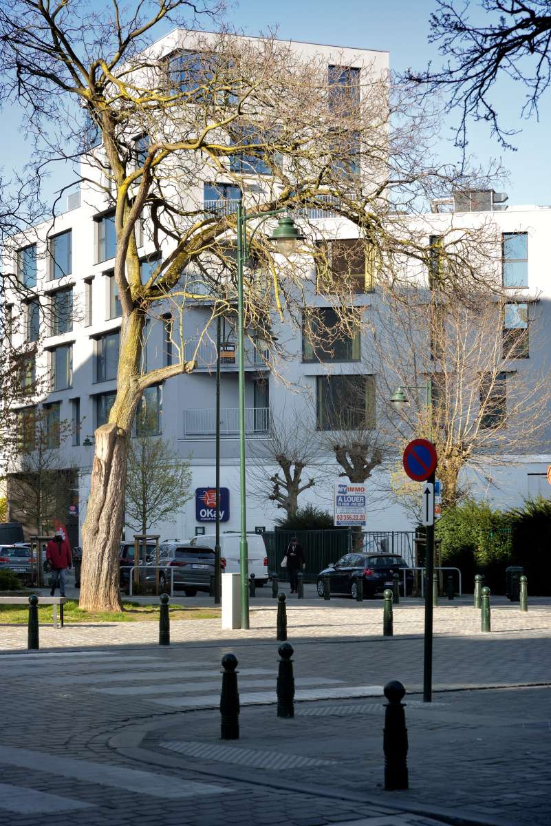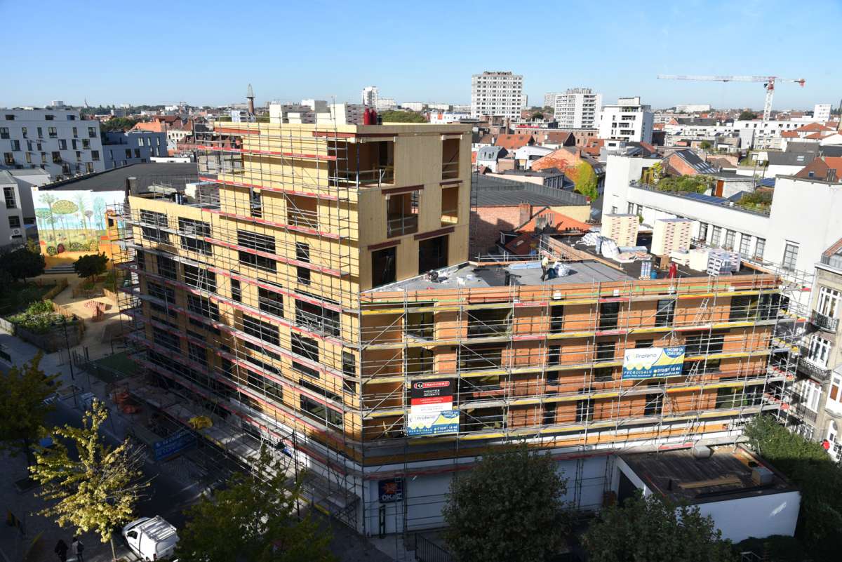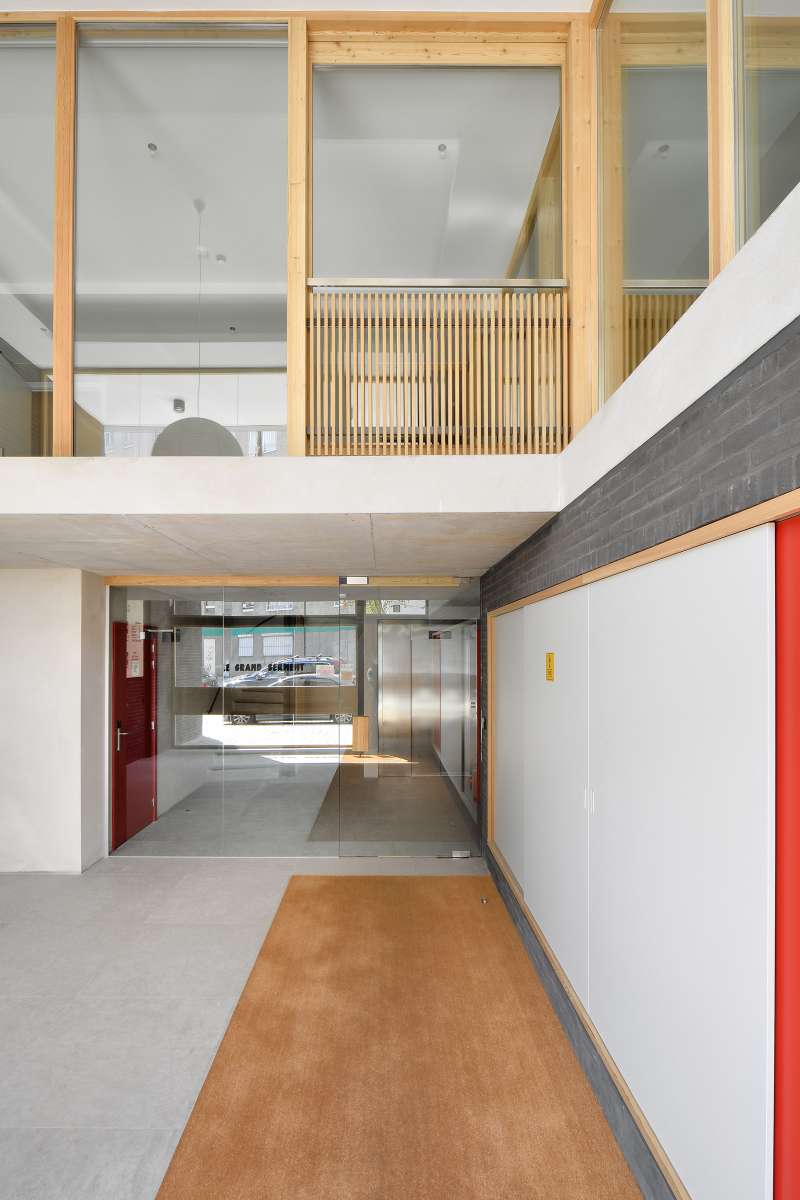 Le site concerné par le projet se situe à l’angle des rues du Houblon et du Grand Serment, dans le quartier Rempart des Moines. La première phase a permis la réaffectation des locaux de la biscuiterie Dandoy en surface commerciale de proximité OKAY. La seconde phase propose la construction de logements en rehausse du socle commercial existant, 21 logements pour 2 ou 3 étudiants sur les 3 premiers niveaux, et 6 logements, dont 2 duplex 4 chambres aux derniers niveaux, soit un ensemble de 27 unités. La contrainte – économique et écologique – de la conservation du socle bâti existant a déterminé le choix d’une architecture à structure légère, déposée sur le rez commercial. Le traitement des façades rue exprime le principe de construction CLT (cross laminated timber) retenu pour des raisons de faisabilité économique (rapidité, coût réduit) et de légèreté. Ce type de construction appliqué à un bâtiment de 6 niveaux, est pour la première fois expérimenté à Bruxelles. Les surfaces largement vitrées des séjours sont triangulées intérieurement ; des pare-soleils, jouant également le rôle de pare-feu, modulent l’apport de lumière. Les toitures plates sont traitées en toitures vertes ou terrasses accessibles, dans une limite garantissant l’absence de nuisances aux voisins directs de la rue du Houblon. Des fonctions partagées pour les étudiants et les familles sont implantées en rez et mezzanine. Le projet est neutre carbone.