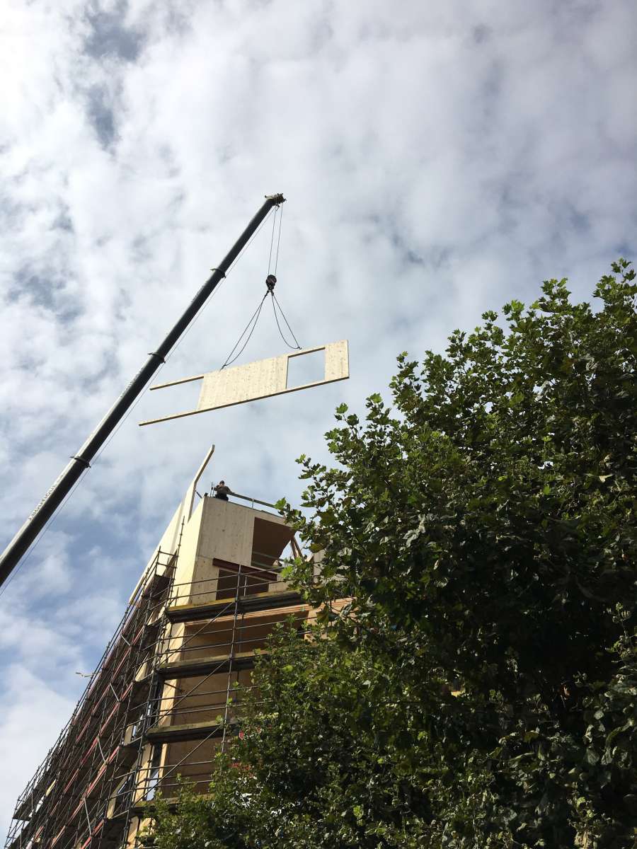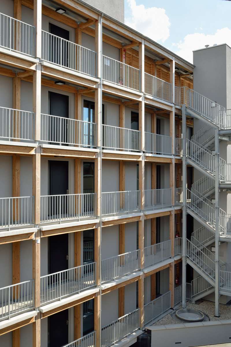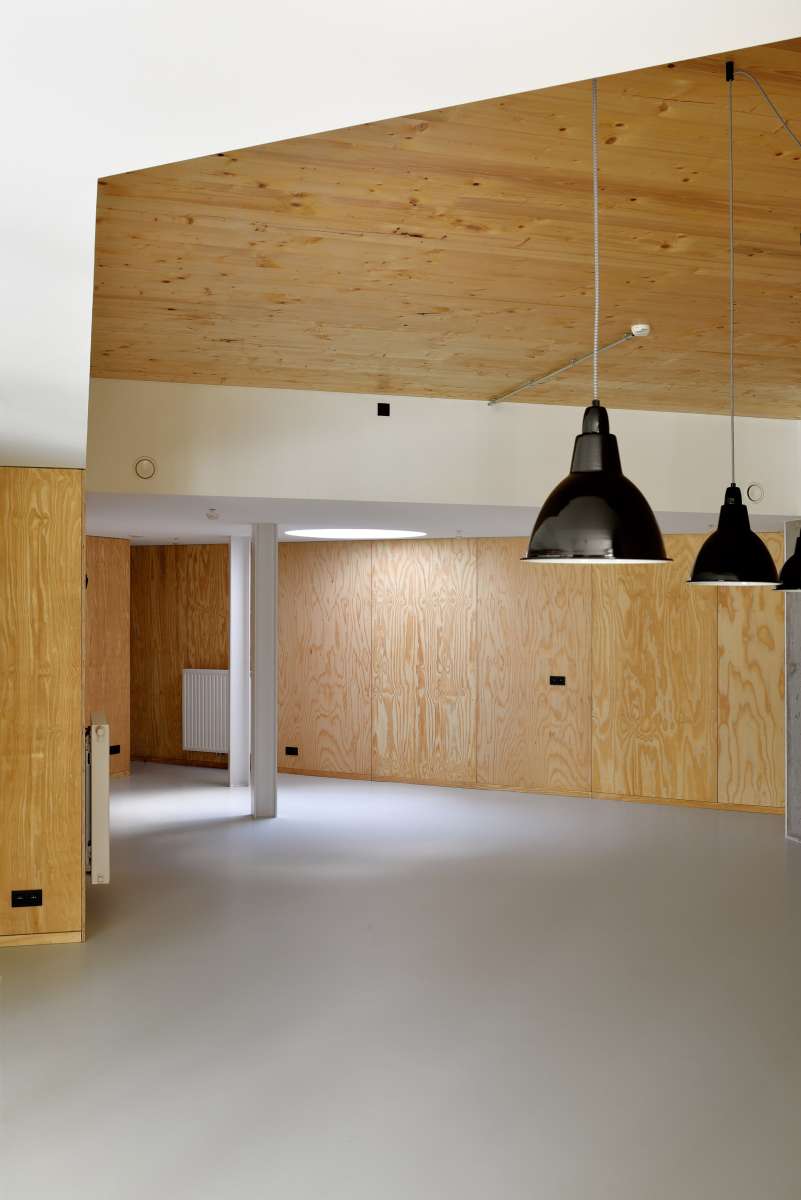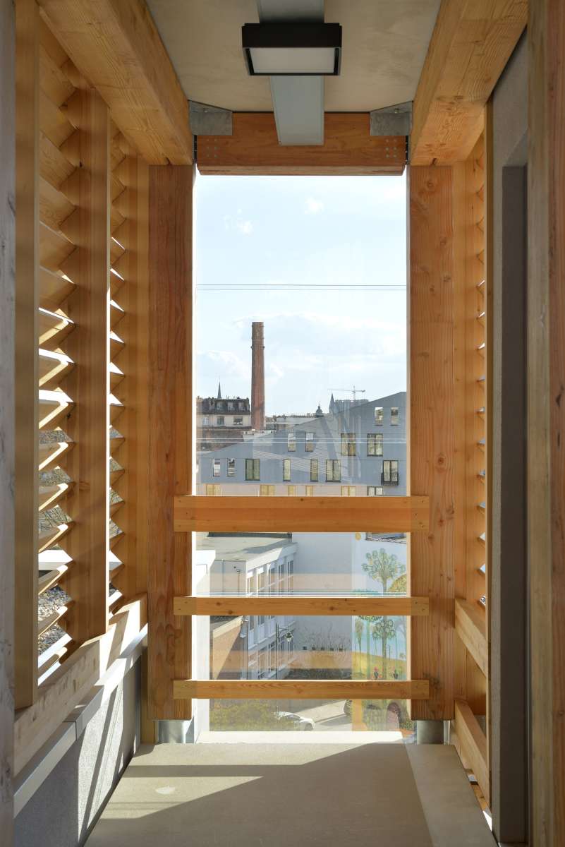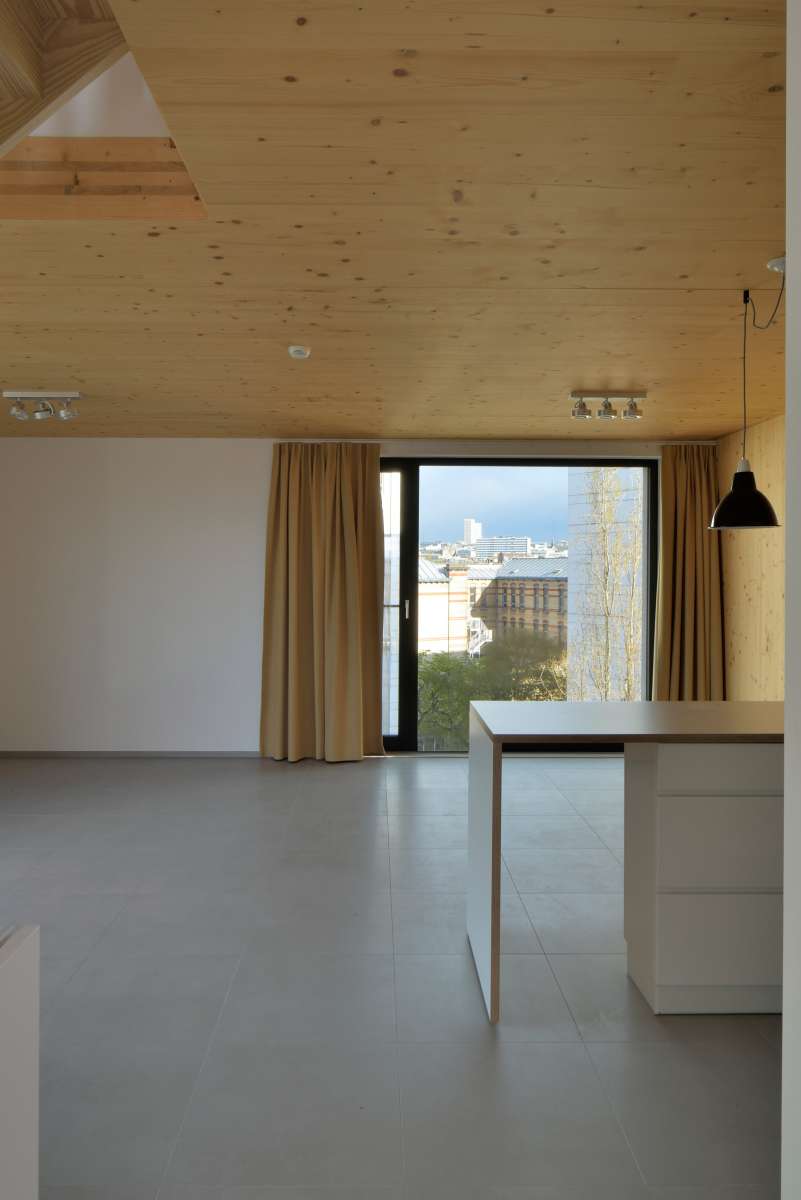 Le site concerné par le projet se situe à l’angle des rues du Houblon et du Grand Serment, dans le quartier Rempart des Moines. La première phase a permis la réaffectation des locaux de la biscuiterie Dandoy en surface commerciale de proximité OKAY. La seconde phase propose la construction de logements en rehausse du socle commercial existant, 21 logements pour 2 ou 3 étudiants sur les 3 premiers niveaux, et 6 logements, dont 2 duplex 4 chambres aux derniers niveaux, soit un ensemble de 27 unités. La contrainte – économique et écologique – de la conservation du socle bâti existant a déterminé le choix d’une architecture à structure légère, déposée sur le rez commercial. Le traitement des façades rue exprime le principe de construction CLT (cross laminated timber) retenu pour des raisons de faisabilité économique (rapidité, coût réduit) et de légèreté. Ce type de construction appliqué à un bâtiment de 6 niveaux, est pour la première fois expérimenté à Bruxelles. Les surfaces largement vitrées des séjours sont triangulées intérieurement ; des pare-soleils, jouant également le rôle de pare-feu, modulent l’apport de lumière. Les toitures plates sont traitées en toitures vertes ou terrasses accessibles, dans une limite garantissant l’absence de nuisances aux voisins directs de la rue du Houblon. Des fonctions partagées pour les étudiants et les familles sont implantées en rez et mezzanine. Le projet est neutre carbone.