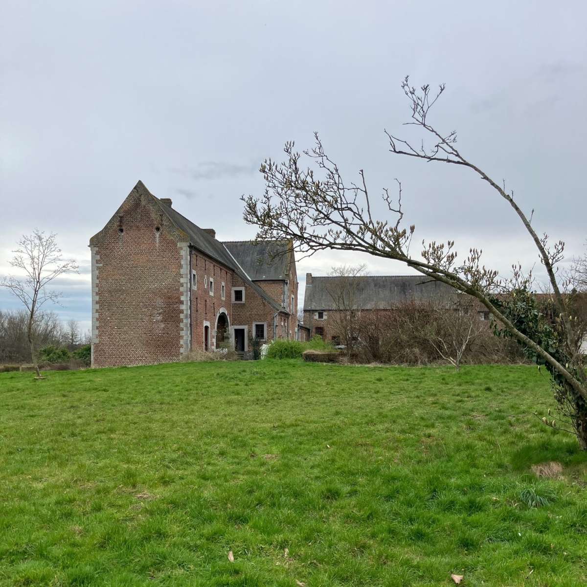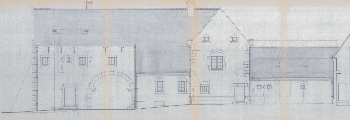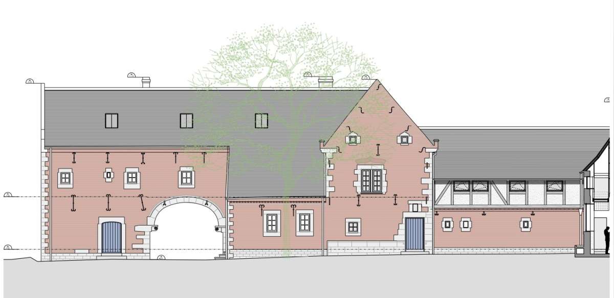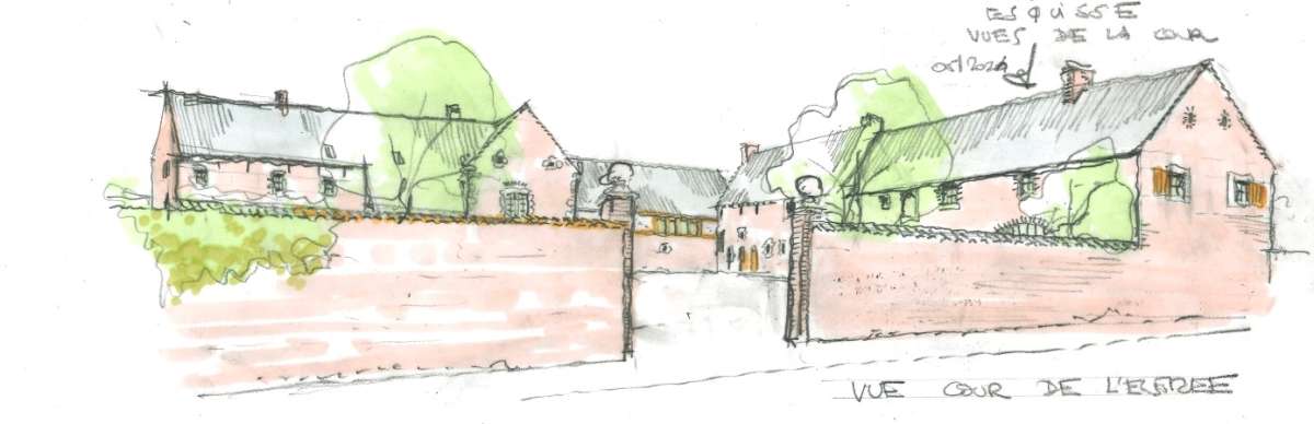 Château-ferme remontant pour ses parties les plus anciennes au XVIe siècle, formant originellement un quadrilatère face à l’église du village et comprenant logis, logis métayer, grange et anciennes écuries. Remanié en 1974 par l’architecte Francis Bonaert, en supprimant l’ancienne ferme clôturant la cour au Nord, le château-ferme conserve néanmoins de nombreux éléments remarquables témoignant de ses différentes phases de construction. Le projet de rénovation prévoit la création d’une galerie d’étage reliant le logis à l’ancien logis métayer, la construction d’une annexe discrète en appentis accentuant la relation entre les deux ailes perpendiculaires, l’amélioration de l’habitabilité des anciennes écuries par le percement ponctuel de nouvelles baies, la réfection partielle des toitures, la révision des aménagements intérieurs du logis et la construction d’une dépendance au Nord, sur l’empreinte de l’aile démolie. Les performances énergétiques du bâtiment sont sensiblement améliorées grâce au remplacement des châssis, dans le respect de leur division existante et l’isolation de l'enveloppe par des matériaux naturels.