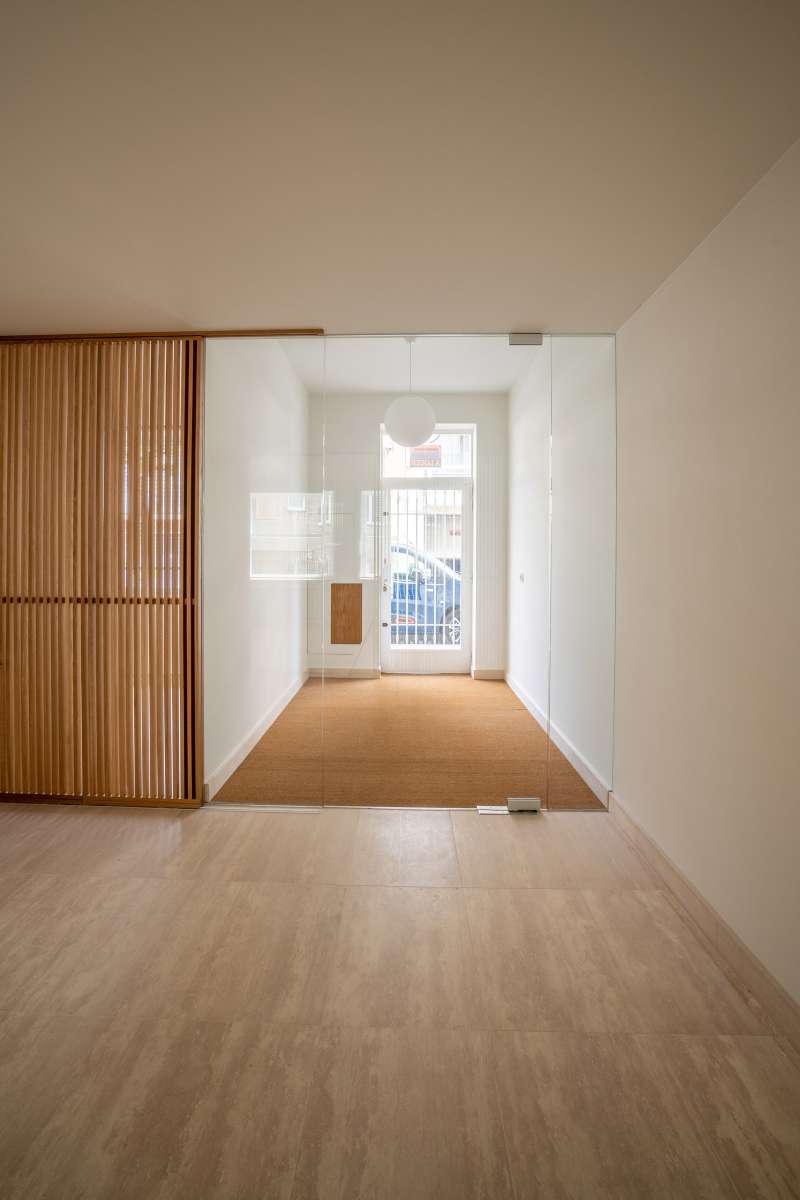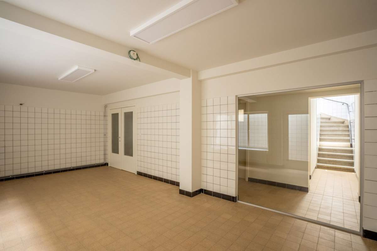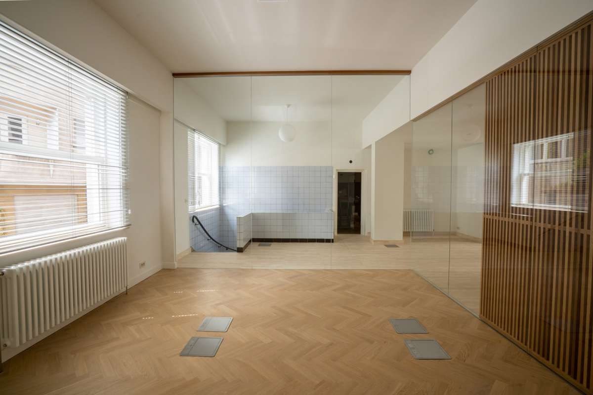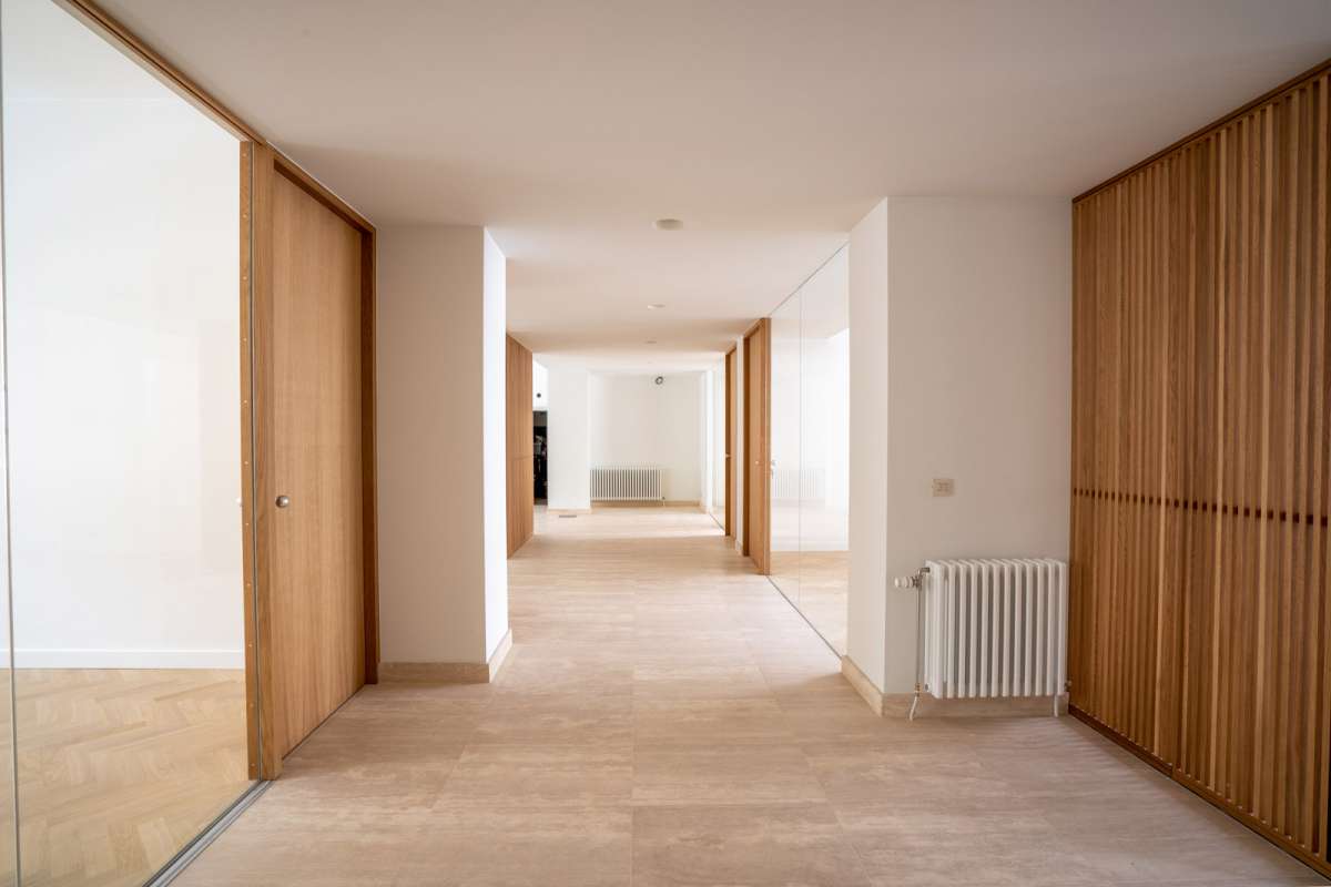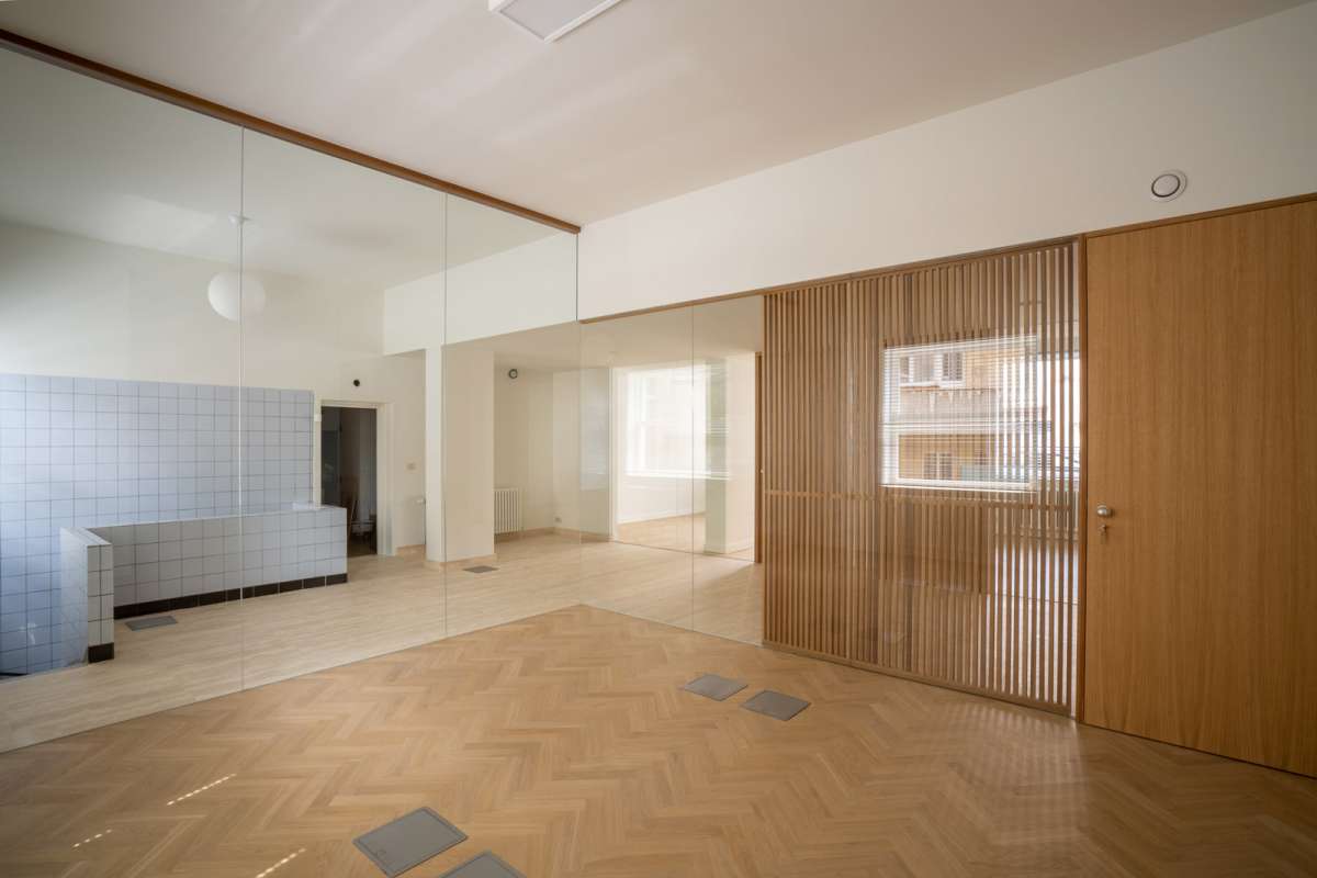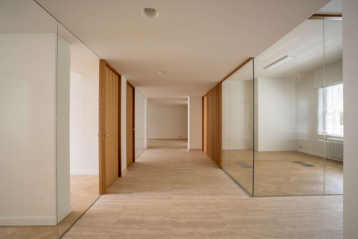 Dans un immeuble de style international d’après-guerre, ancien bureau de poste sur deux niveaux converti en bureaux destinés à la location. Les altérations tardives des années 80 ont été gommées, les éléments d’origine intéressants – châssis acier côté rue, faïences, carrelages en caves – ont été conservés et restaurés. Les interventions nouvelles et matériaux choisis – chêne, travertin - restent respectueux des qualités de simplicité de l’architecture existante, en les réveillant par une mise en contraste mesurée. Les interventions en techniques spéciales se veulent délibérément minimales, peu coûteuses et à entretien réduit.