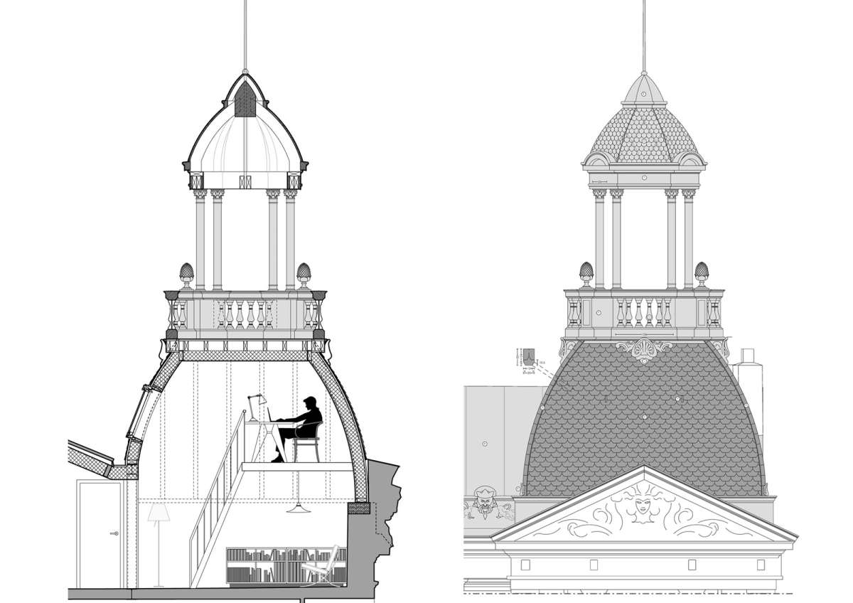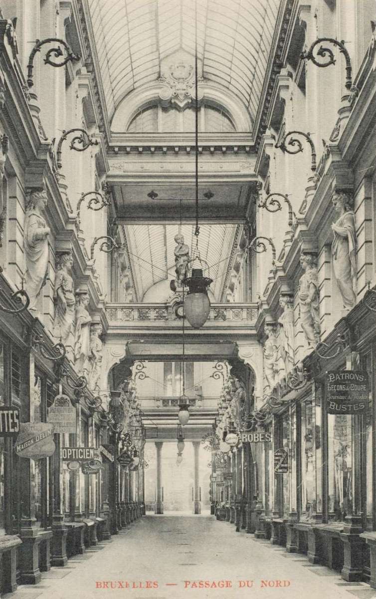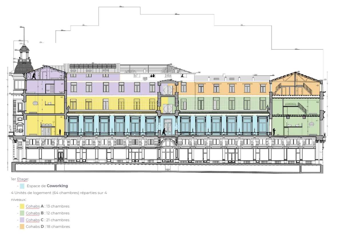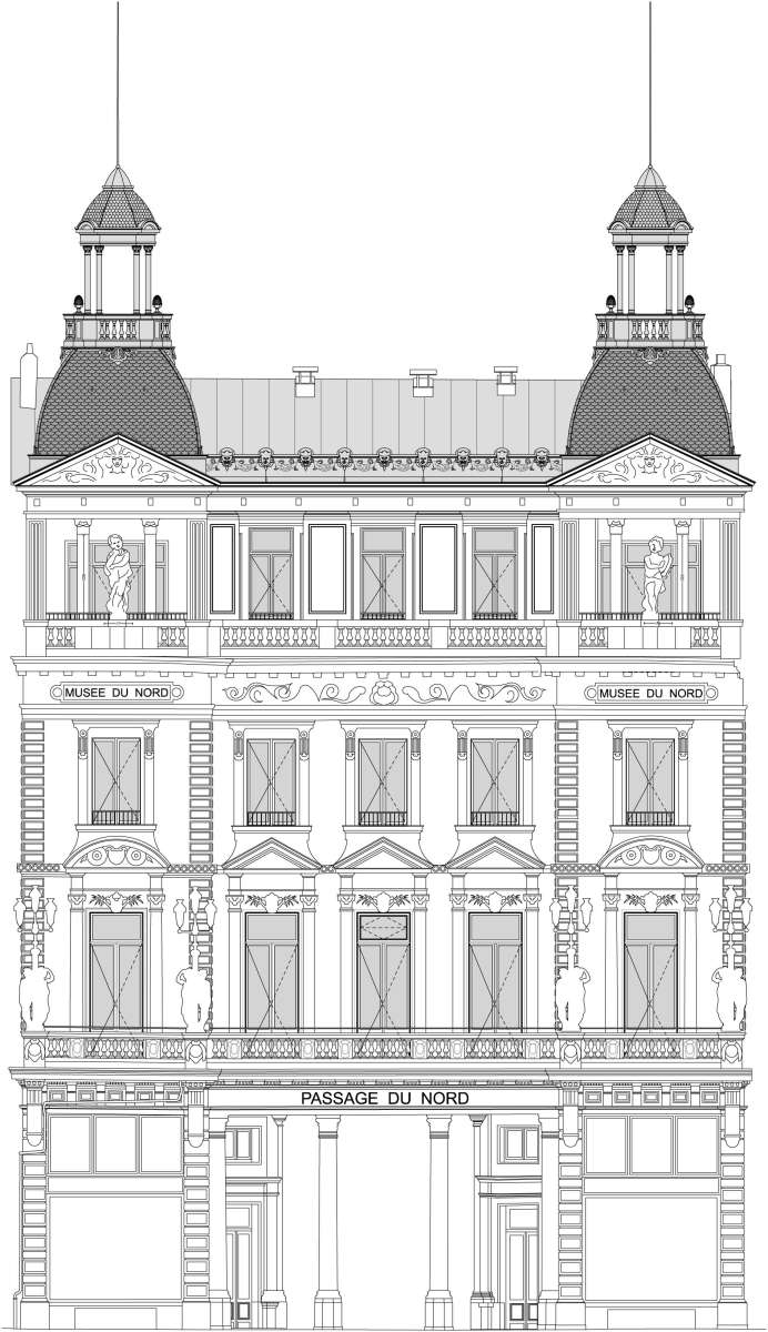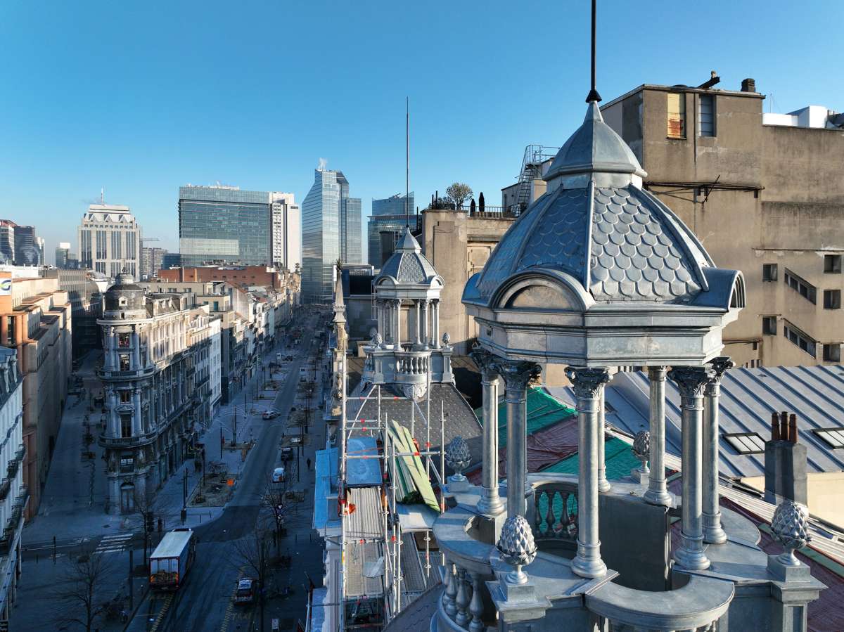 Situé en plein centre de Bruxelles, le Passage du Nord constitue l’un des ensembles les mieux conservés du dernier quart du 19è siècle. La façade avant donnant sur la Place de Brouckère, la façade arrière sur la rue Neuve 40-44, les façades intérieures – en ce compris les cariatides, la passerelle et les lampes en fonte, le pavement et la verrière – ont été classées par arrêté du Gouvernement de la Région de Bruxelles-Capitale le 8 septembre 1994. Tour à tour Musée, extension de l’Hôtel Métropole voisin, puis centre de conférence dans les années 1990, le Passage du Nord se prépare à une nouvelle vie, dans un centre urbain en plein renouveau. L’affectation en commerces du rez-de-chaussée et de l’entresol n’a pas varié depuis l’origine, encouragée par une récente restauration de qualité de l’ensemble des façades intérieures. Par contre, les étages supérieurs, privés très tôt de leurs décors d’origine et transformés à plusieurs reprises, attendent une nouvelle affectation depuis de nombreuses années. Sur base de ce projet, un contrat de bail emphytéotique entre la Société Civile du Passage du Nord, propriétaire des lieux depuis 1881, et la société COHABS a pu être signé en septembre 2020. COHABS est un groupe international de coliving basé à Bruxelles spécialisé dans la conception de logements modernes, innovants, meublés et entièrement équipés. Le programme de coliving permet de maintenir, voire rétablir, en grande partie les volumes et structures d’origine afin d’y accueillir les espaces privatifs et communs, agrémentés d’un patio et d’un rooftop avec vue panoramique sur le centre-ville. Cette nouvelle affectation très pertinente permettra de redonner enfin vie aux étages d’un bâtiment difficile, mais à l’architecture remarquable. La restitution des deux dômes disparus constituera le point fort de ce projet patrimonial, et rétablira la silhouette caractéristique du Passage du Nord visible depuis les Boulevards du Centre et la Place de Brouckère.
