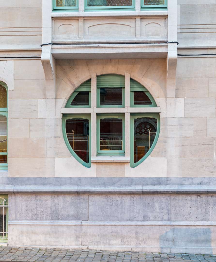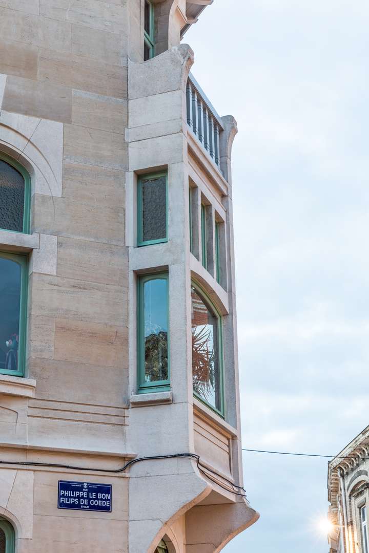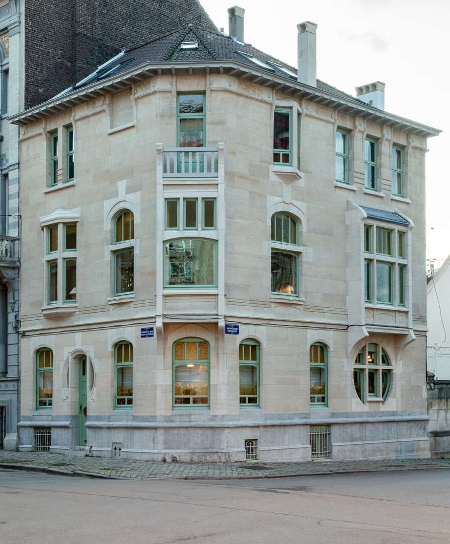 Habitation particulière et bureaux de l’architecte Victor Taelemans (1864 - 1920) construite dans un style Art nouveau dépouillé et personnel, d’une belle tenue. L'escalier et la distribution intérieure tirent pleinement parti de la parcelle d’angle. Le projet de restauration a permis la restitution du terrasson en zinc, de la verrière de toiture éclairant la cage d’escalier, et de la couverture en plomb en écailles de la bretèche. Les menuiseries extérieures ont été déposées en atelier, et les remarquables châssis pivotants remis en fonction. La vitrerie d’Art, en partie disparue, a pu être complètement rétablie sur base des éléments subsistants et de photos anciennes, tout comme les éléments en ferronnerie manquants. La frise – entièrement détruite - et le panneau d’imposte de la fenêtre du second étage en toiles peintes marouflées, attribués à Gisbert Combaz (1869-1941), ont fait l’objet d’une étude approfondie qui a permis la restitution de l’ensemble, mais sous la forme plus pérenne d’une peinture murale, par le peintre-décorateur et restaurateur Marianne De Wil.