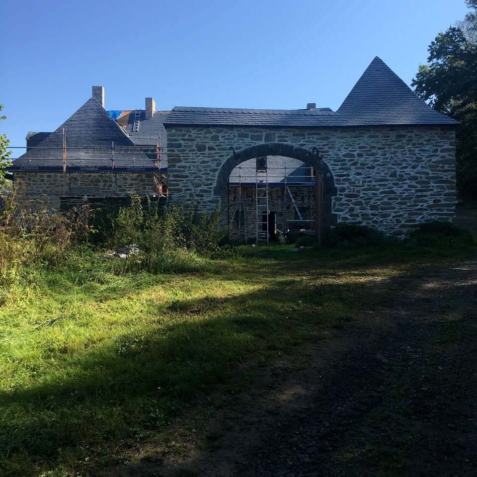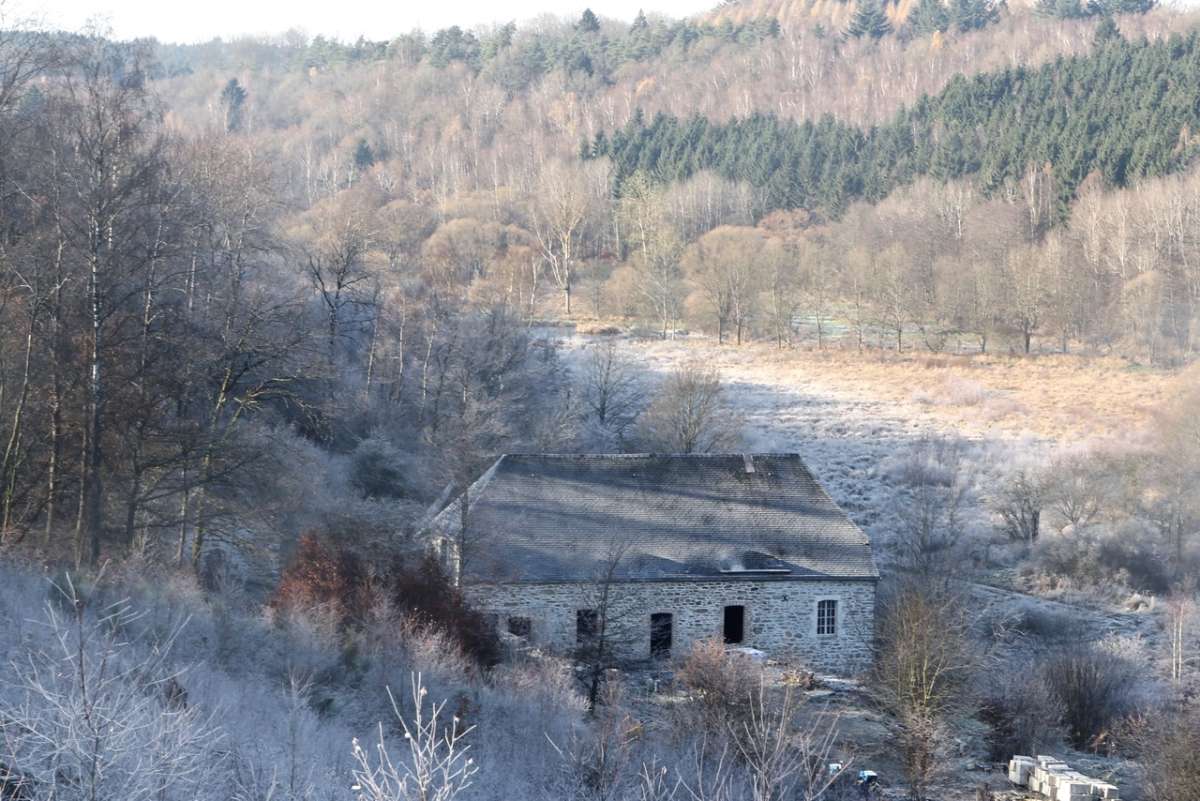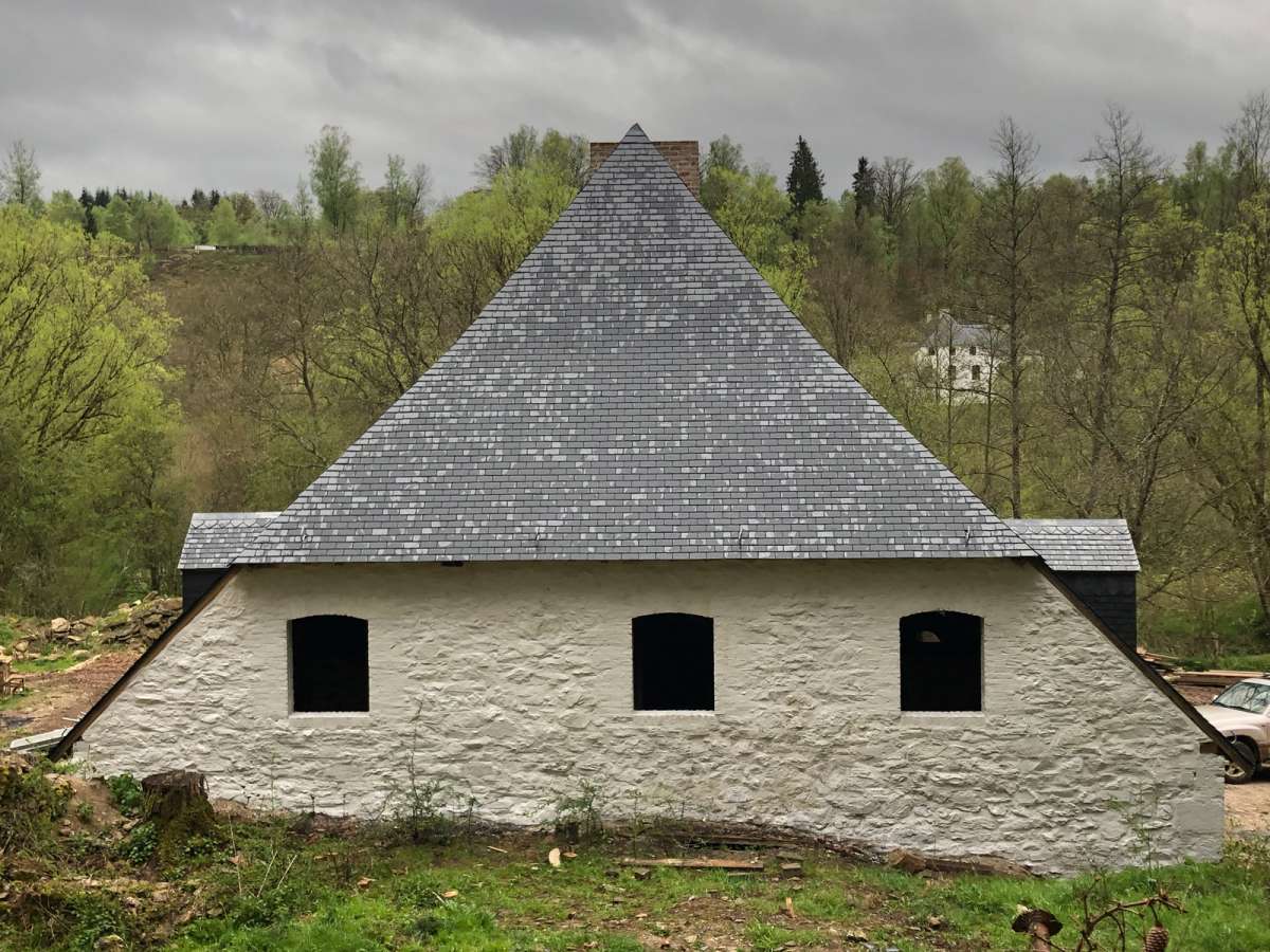 Dans la Vallée de l’Eau Noire, site d’une ancienne forge disparue, dont subsistent la maison du maître ou contremaître de forge et les ruines d’une ferme du XIXème siècle. Le projet du Maître d’Ouvrage est de gérer un ensemble de bois de +-180Ha dans une optique écologique et paysagère dans la Vallée de l’Eau Noire ; il vise la suppression des plantations artificielles (résineux et peupliers) et la restauration d’anciennes prairies et de milieux humides qui s’apparentent aux zones récemment proposées pour NATURA2000. Dominant la vallée, la maison du Pont St Nicolas est constituée petit ensemble clôturé bâti au XVIIIème groupant un logis, des étables – transformées en habitation vers 1980 – et diverses remises. Le projet architectural vise à gommer les interventions malheureuses par la réinterprétation des modèles locaux ayant pu être observés sur des bâtiments encore intacts. La toiture retrouvera sa masse et les maçonneries de calcaire seront remaillées avec des matériaux de récupération ou similaires, dans le respect de l’appareil existant. De l’autre côté de la rivière, la ferme des Migneries sera reconstruite sur base des relevés et photos anciennes, sur de nouvelles fondations. L’étable et la grange resteront sur terre battue. Les principes directeurs de la reconstruction sont identiques à ceux de la restauration du Pont St Nicolas décrits ci-avant, à la différence que les fonctions agricoles du bâtiment – ici maintenues – nous permettent un respect quasi intégral de l’architecture originelle, particulièrement en ce qui concerne les étables, grange et fenil.