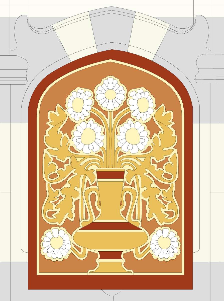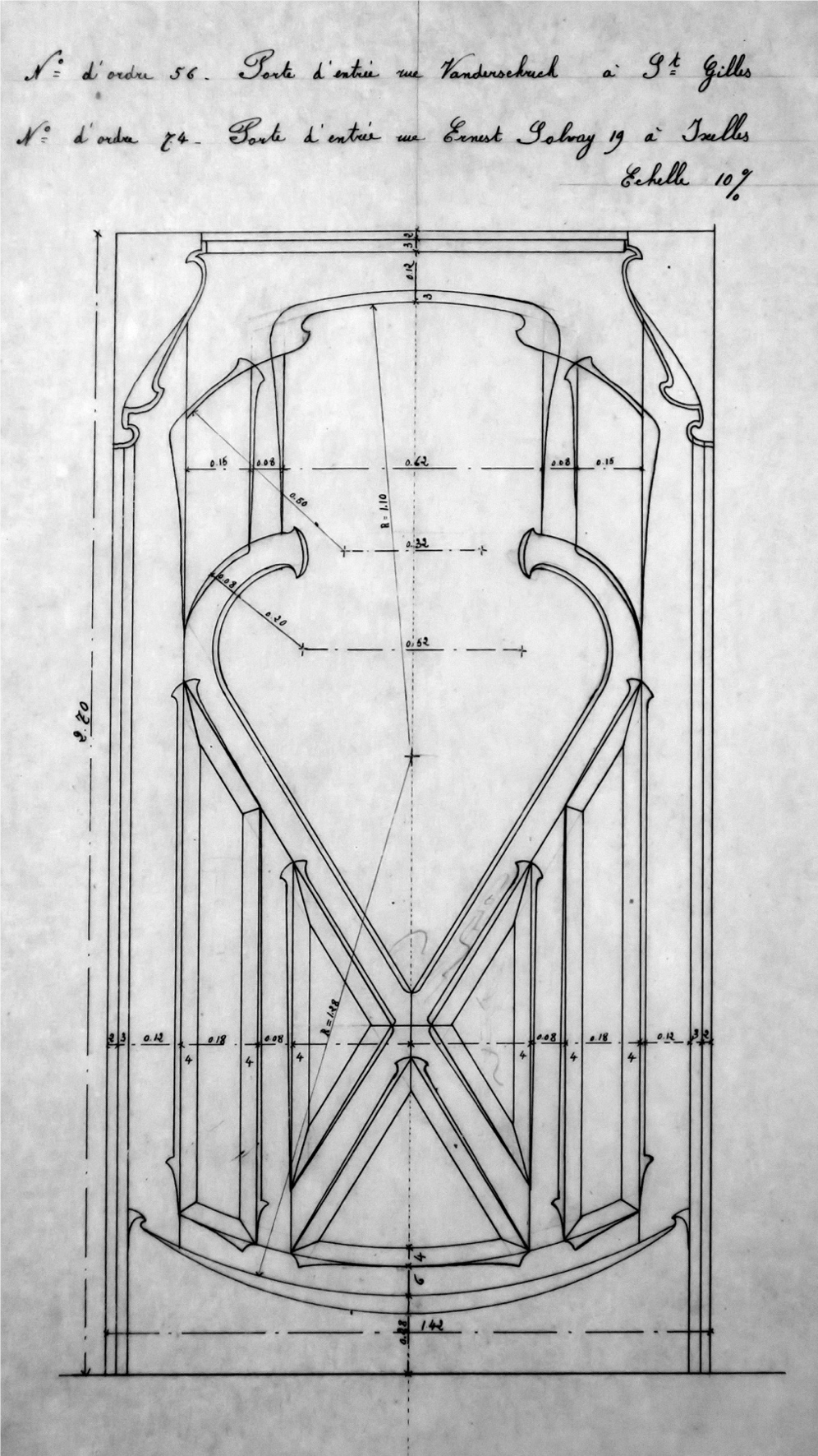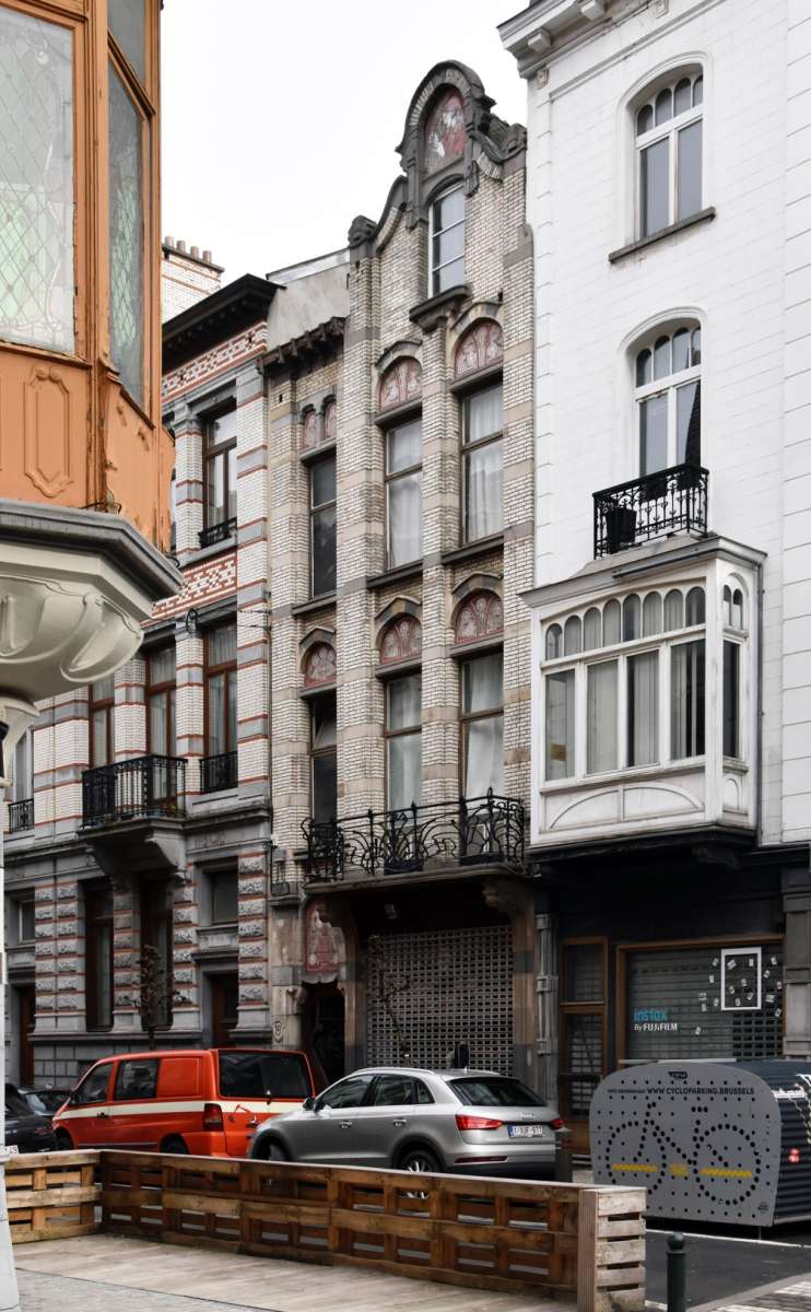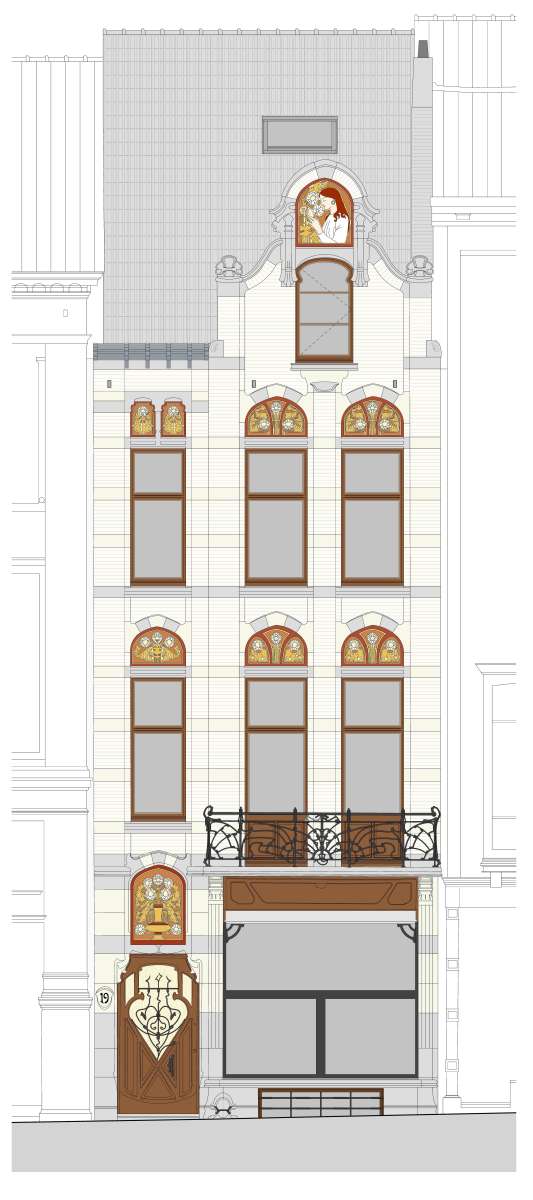 Maison de commerce et d’habitation de style Art Nouveau réalisée par l’architecte Ernest Blérot (1870-1957) dans le quartier Saint-Boniface à Ixelles. Destinée à l’origine à une fonction de cabaret au rez-de-chaussée, dont les employés logeaient aux étages, la maison a conservé son affectation commerciale, et comprend trois appartements distincts aux étages. Elle s’inscrit dans l’ensemble Art Nouveau du Quartier St Boniface, dans lequel Ernest Blérot réalise 10 maisons du même style. La façade principale a fait l’objet de plusieurs campagnes de restauration (1980 -1990) approchant plus ou moins l’état d’origine et plus récemment, de transformations malheureuses (remplacement du châssis du pignon chantourné, réfections de joints des maçonneries, vitrine du rez-de-chaussée, etc.). Le projet vise a permis la restauration des menuiseries extérieures (porte d’entrée, cartouche de l’enseigne commerciale et châssis en chêne vernis) et des maçonneries endommagées, ainsi que la restitution d’éléments tels que les teintes d’origine des sgraffites, restaurés par Marie-Hélène Ghisdal, ou le décrottoir perdu. Les maisons-sœurs dessinées par Ernest Blérot dans les années 1900, entre autres à Saint Gilles, ont permis de restituer les éléments disparus sur une base documentée.