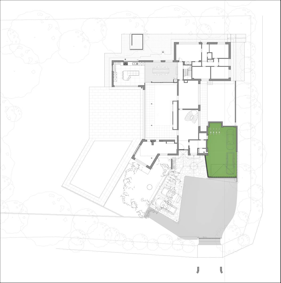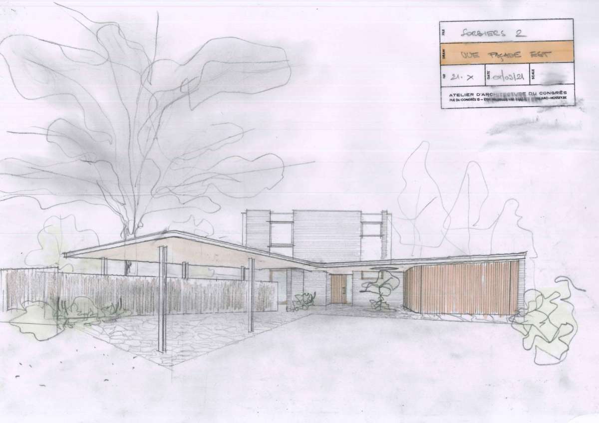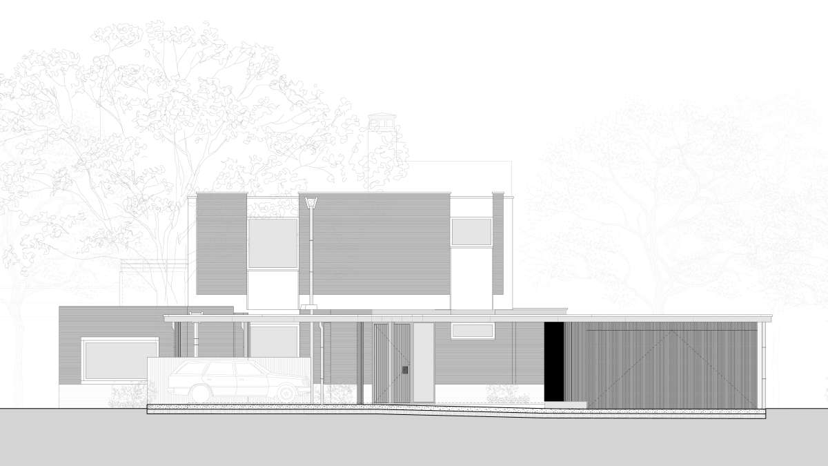 Habitation particulière fonctionnaliste, partiellement transformée en 1983 pour l’Ambassade de Finlande. Le projet prévoyait l’étude de réaménagement de la cuisine et de la salle à manger, le remaniement de la façade sur jardin et la construction d’un auvent en béton armé et d’un garage pour véhicules de collection. L’auvent est réalisé en béton brut coffré sur voliges non rabotées, posé sur des colonnes métalliques de profil H. Le volume du garage est réalisé en ossature bois indépendante, revêtu d’un bardage en bois exotique à petites sections.