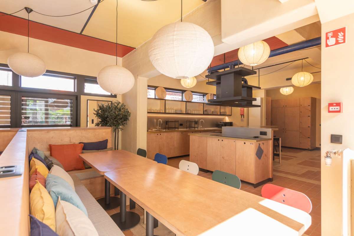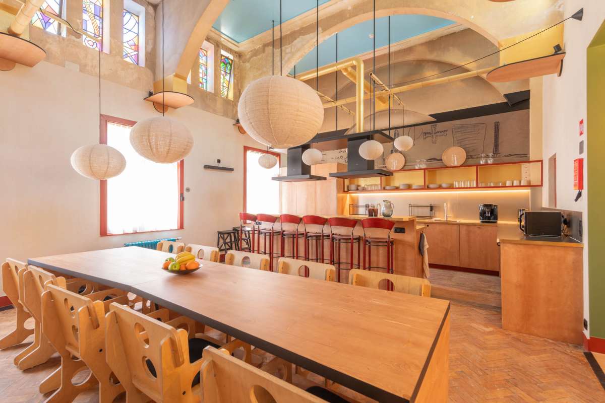 Le projet a permis le maintien de la majorité des aménagements existants (cloisonnement intérieur, circulations), afin de limiter les démolitions et de tirer parti de la disposition existante de l’ancienne auberge de jeunesse. 4 unités de coliving, soit 65 chambres, réparties dans les 3 bâtiments. Une attention particulière a été accordée à l’ancienne chapelle de l’Office Catholique Nationale du Cinéma, dont la volumétrie, les vitraux, les arcades ont été restaurés afin d’y accueillir un confortable espace commun pour une des quatre unités de co-living.