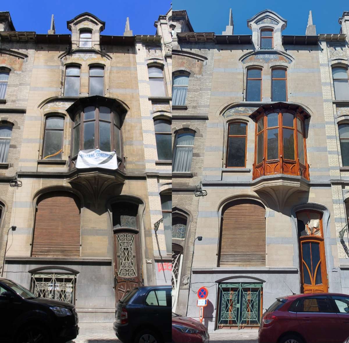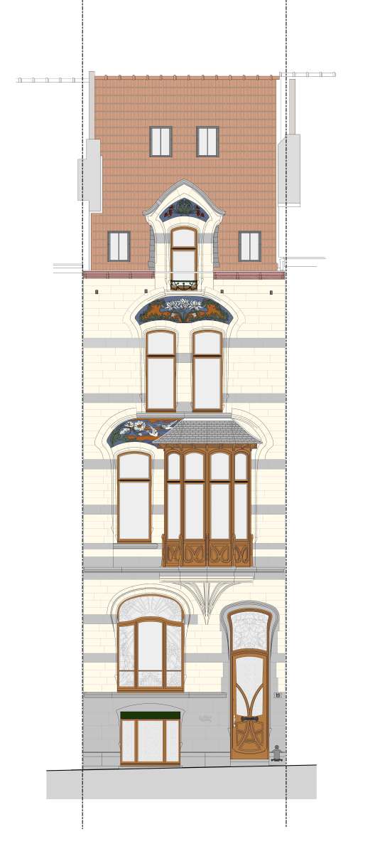 Projet de restauration d’une maison de rapport signée Ernest Blérot, située rue Vanderschrick au sein du remarquable ensemble Art Nouveau construit par l’architecte entre 1900 et 1902. La façade du bâtiment présente une composition soignée s’intégrant dans la cohérence de l’enfilade, avec son bow-window sur cul-de-lampe ouvragé, ses encadrements de baies en « coup de fouet » et une élégante bichromie de pierre de Savonnières et de pierre bleue. Les baies sont surmontées de sgraffites, typiques de certaines réalisations de Blérot avec leurs motifs d’oiseaux en plein vol et de fleurs ondoyantes.