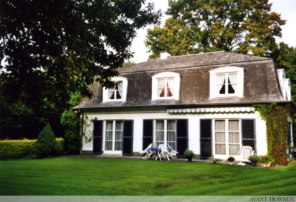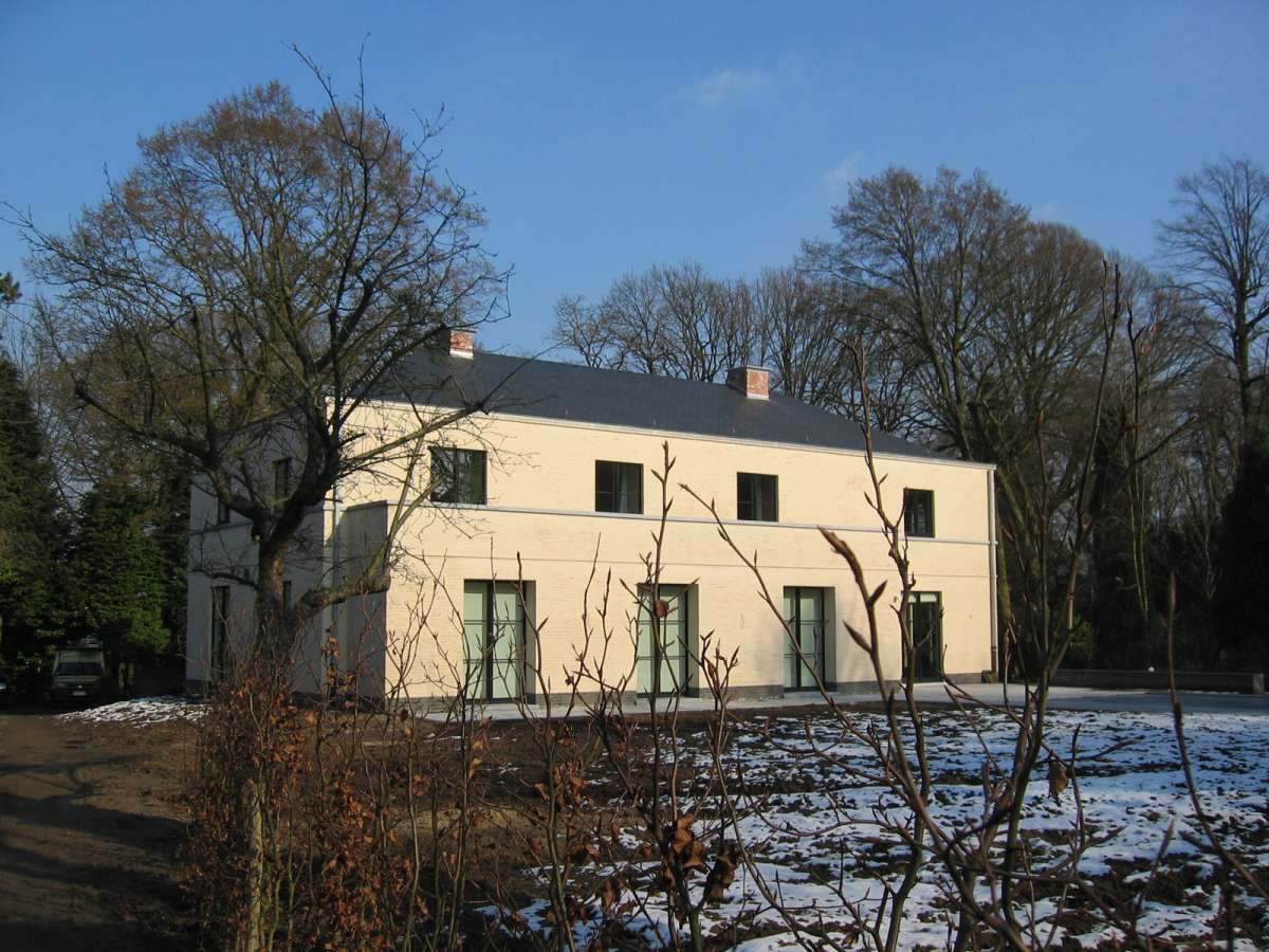 Transformation radicale d’une maison « à la Mansard » des années 1960, tout en tirant parti de la structure et même des proportions existantes. Au Sud, l’adjonction d’un volume complémentaire repris sous une nouvelle toiture à faible pente permet de créer une family- room et l’aile de nuit des parents. A l’Ouest , un volume saillant au rez de chaussée dilate le séjour, créant une coursive extérieure au premier étage. Le parement de briques des façades conservées a été étendu pour les parties neuves, et ensuite unifié par une épaisse peinture à la chaux. Le réaménagement intérieur complet de la maison n’a cependant pas empêché la conservation de certains revêtements de sols tels le parquet du premier étage ou les menuiseries intérieures.